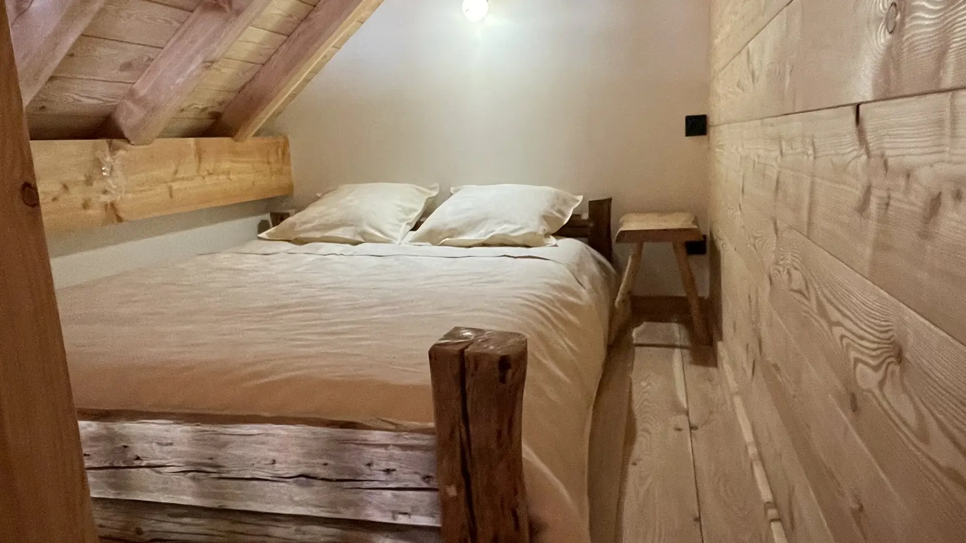 Névache Ville Haute, place de l'église plein coeur du village.Trois chambres individuelles neuves style cosy montagnard dont deux suites (23 m2) sous plafond cathédrale en charpente mélèze apparente dotées d'un beau balcon avec vue sur fond de vallée.