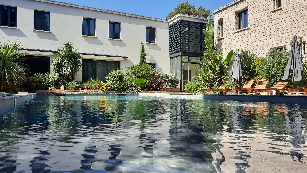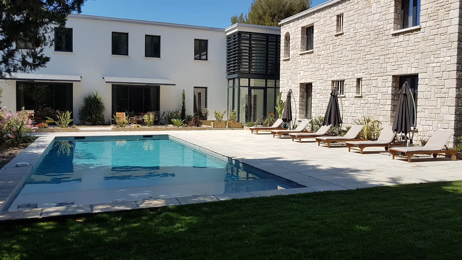Hôtel particulier en pierre de Cassis entièrement réhabilité dans un esprit contemporain avec services, vue mer, parking, piscine, terrasses privatives et jardin.