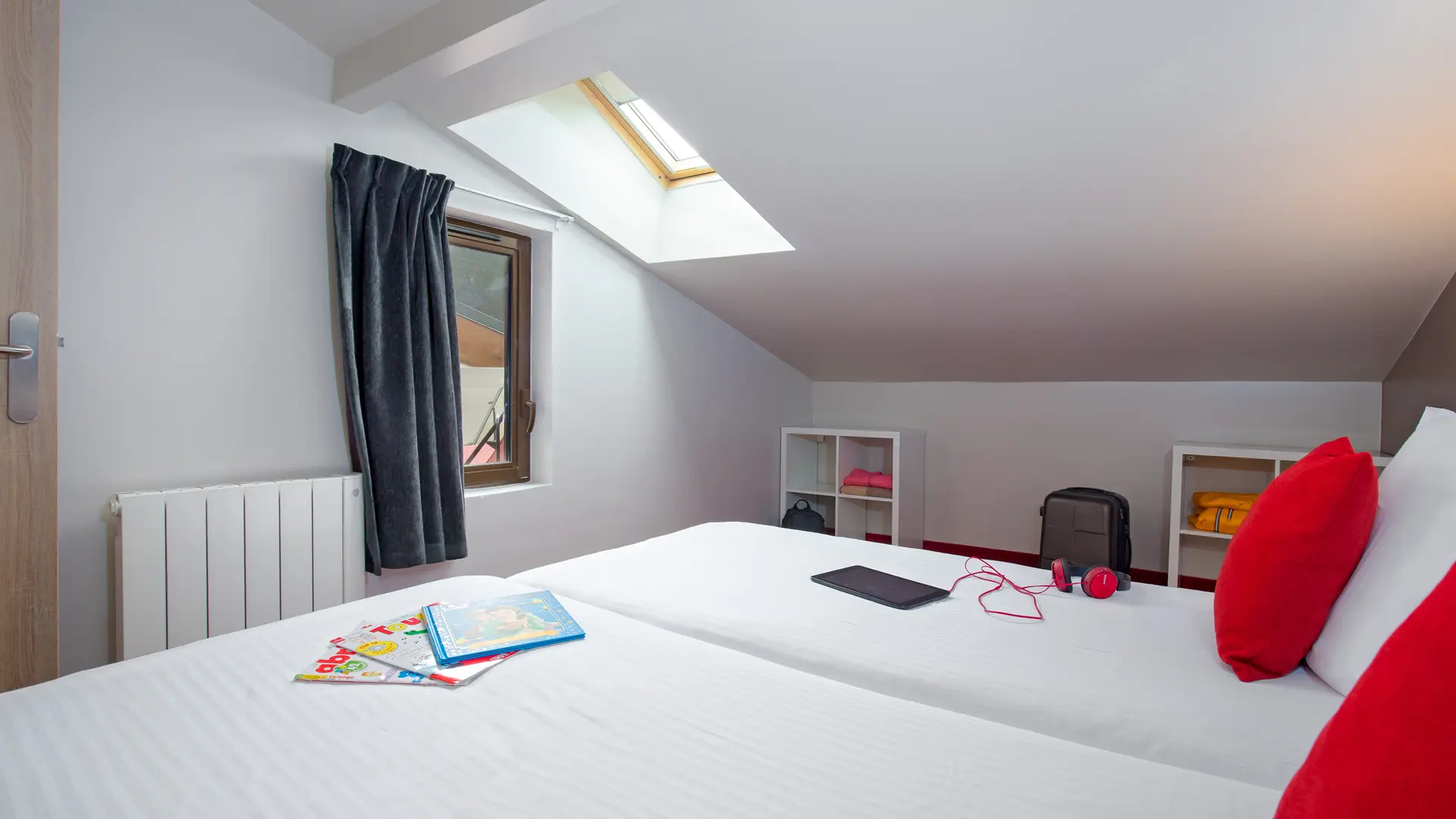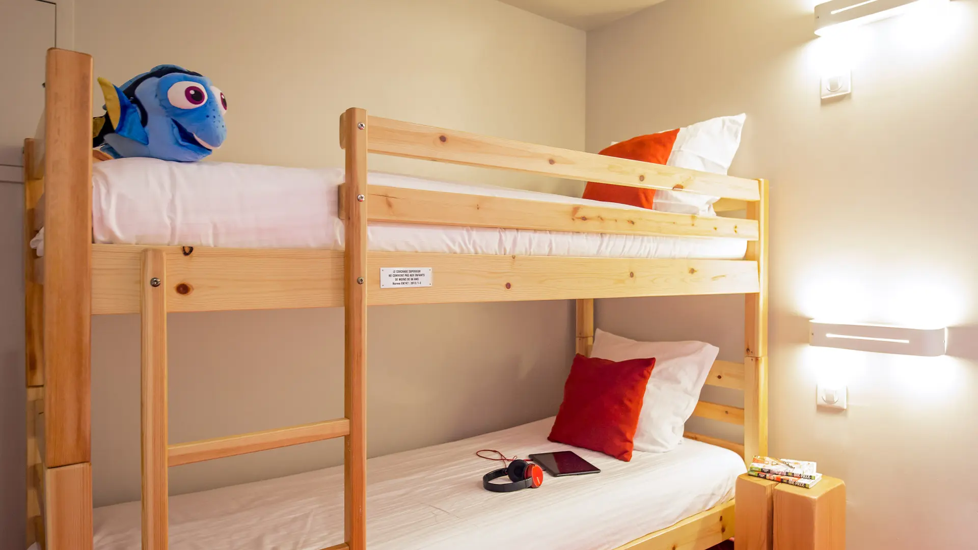 Chambre 2 lits superposés à l’entrée et un lit en 140 (surélevé). Espace de rotation limité.