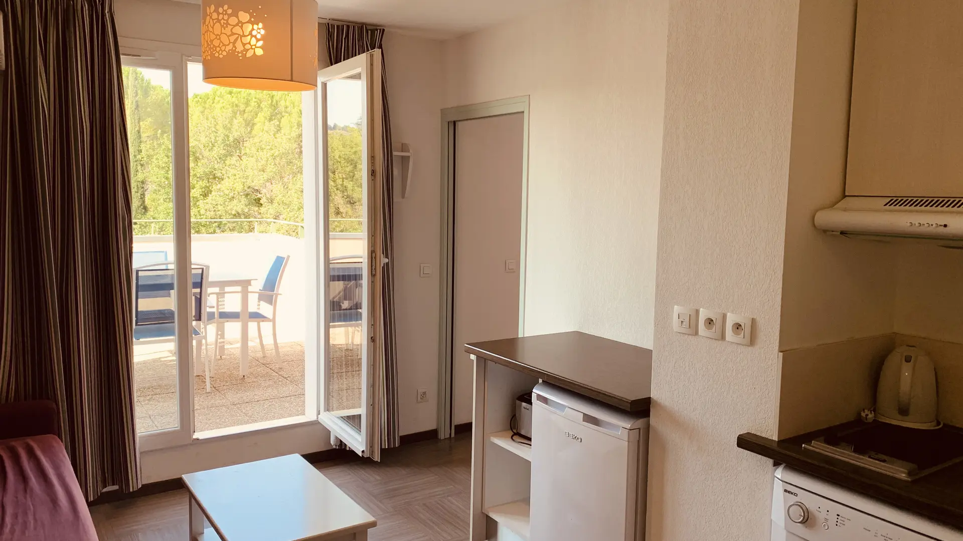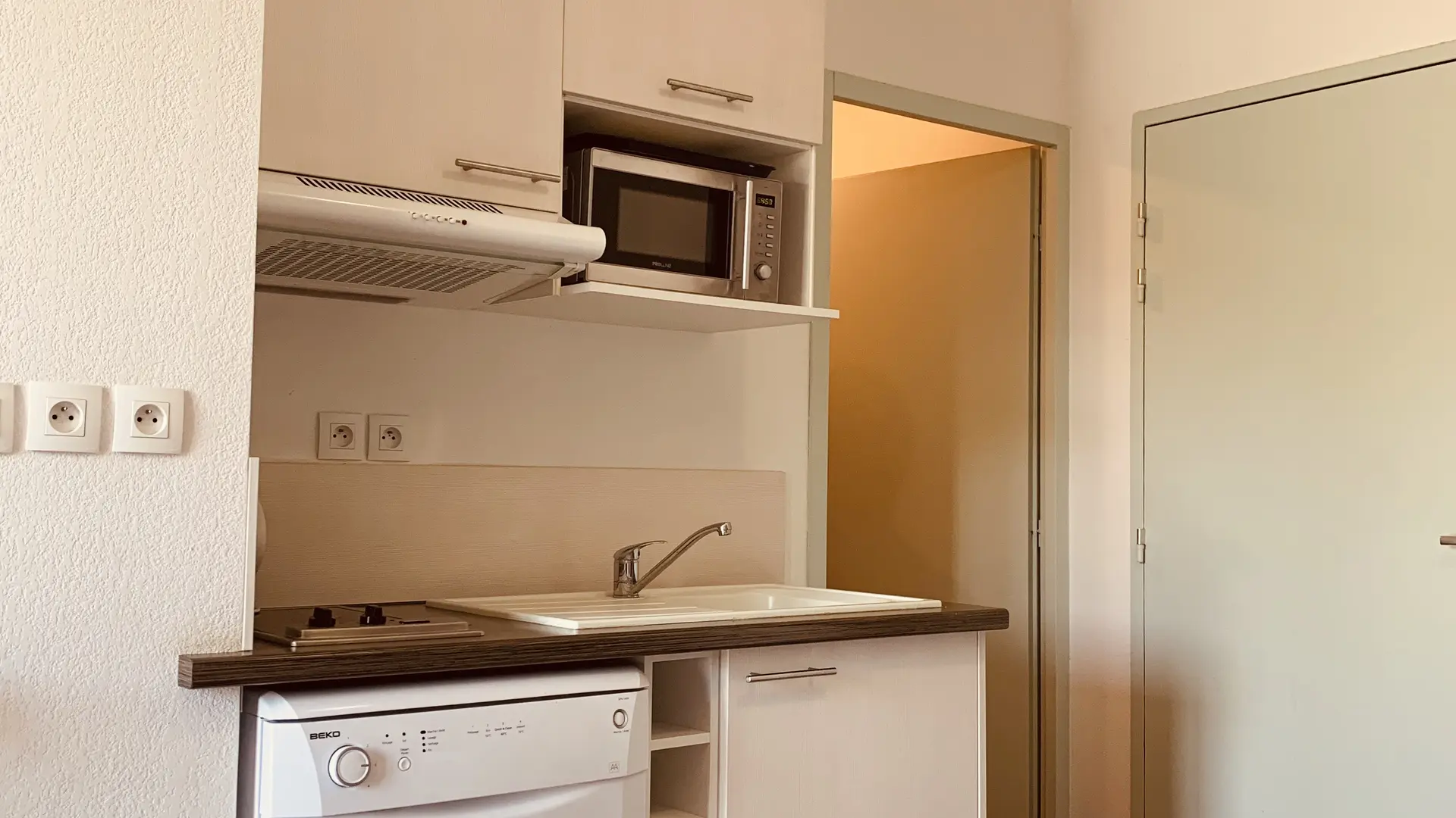 Coin cuisine aménagé (réfrigérateur, four à micro-onde, lave vaisselle, plaque de cuisson, cafetière, ustensiles de cuisine et vaisselle) avec tables et chaises.