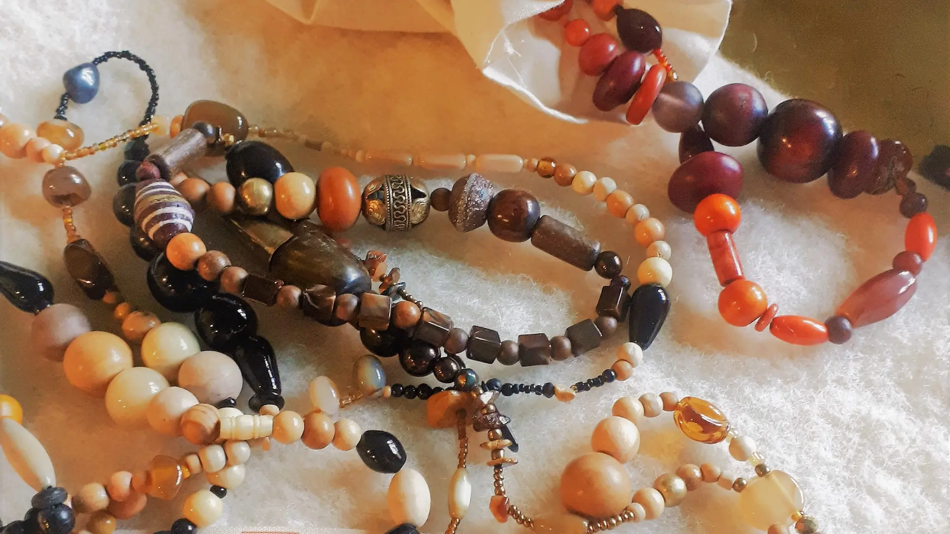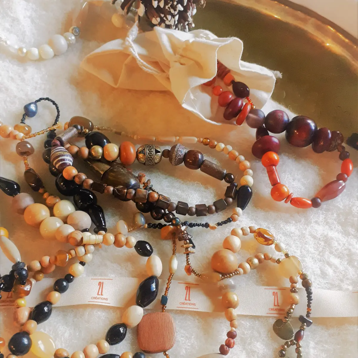 Ghislaine Bourillon propose colliers, sautoirs et bijoux de maison à accrocher au mur ou au plafond.
