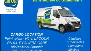 Agence de location relais sur EYGLIERS afin de faire bénéficier nos véhicules aux personnes situées dans le Guillestrois. Tu pourras retirer le véhicule à la réception de l'hôtel Lacour. Des véhicules de type SUV (SUZUKI Across - Vitara) ainsi que des utilitaires (8m³ et 10m³) mais aussi des citadines (SUZUKI Swift - OPEL Corsa - FORD Focus - RENAULT Clio).