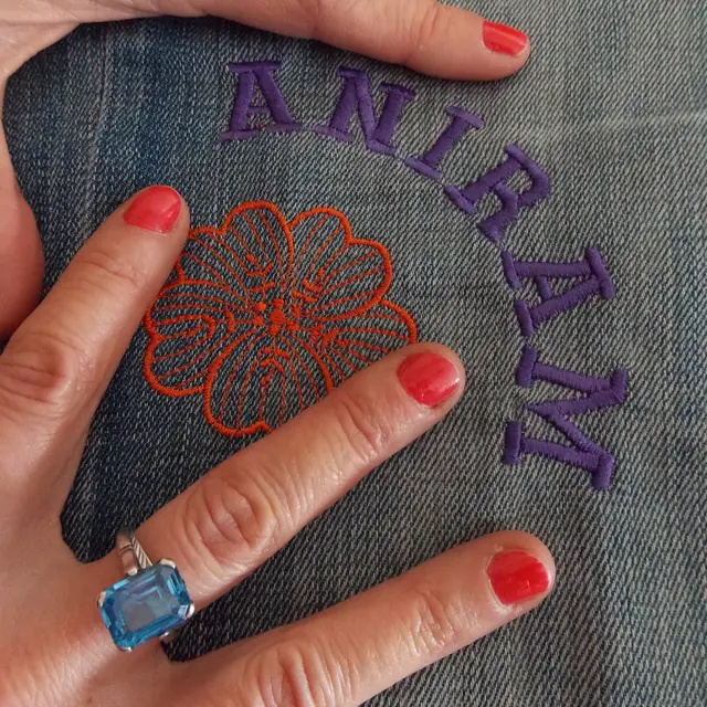 Marina s’est mise depuis peu à la broderie assistée par ordinateur ce qui lui permet de personnaliser certain vêtements ou accessoires si le client le souhaite et d’apposer sa marque « Aniram » sur tous ses vêtements.