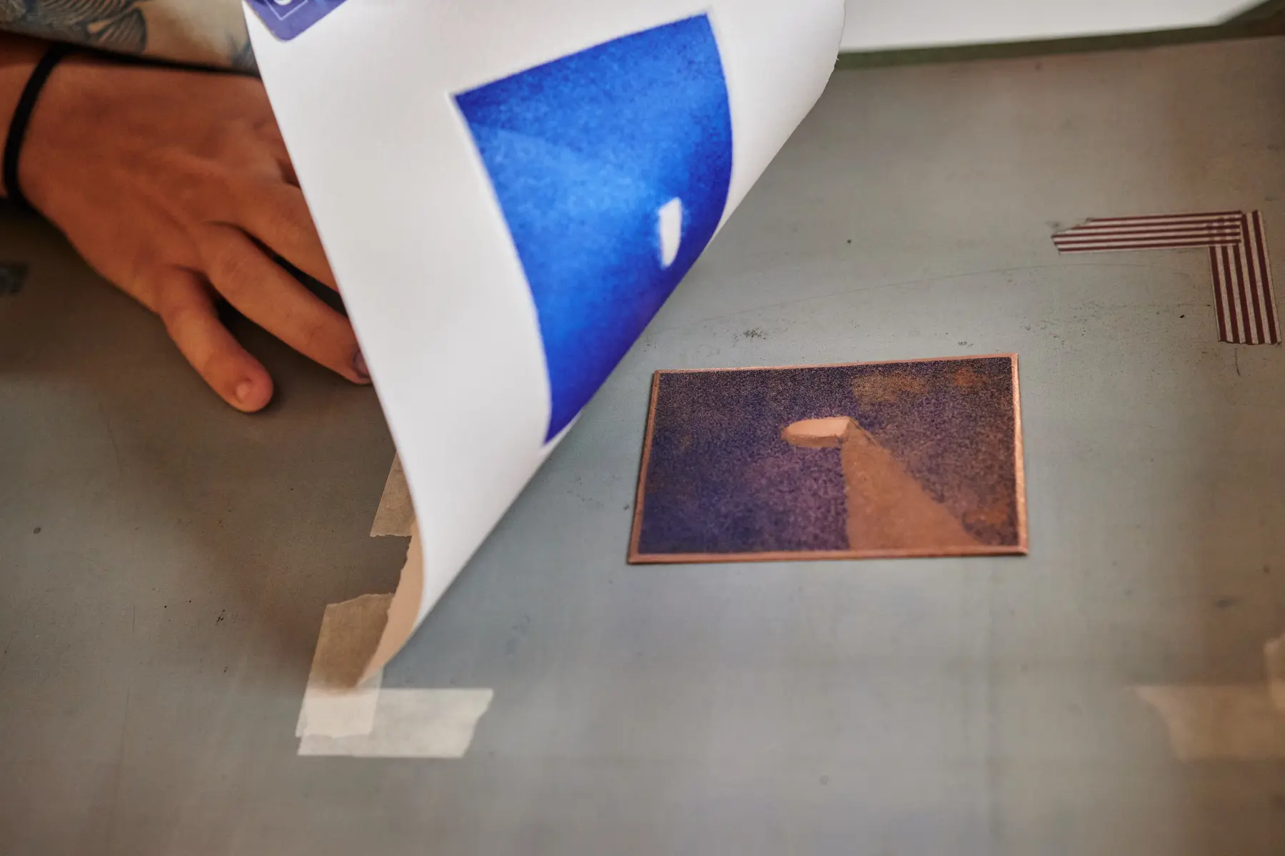 Estelle Monna pratique différentes techniques de gravure et d'impression au sein de son atelier, de la taille d'épargne à la taille-douce en passant par l'eau forte et le monotype.