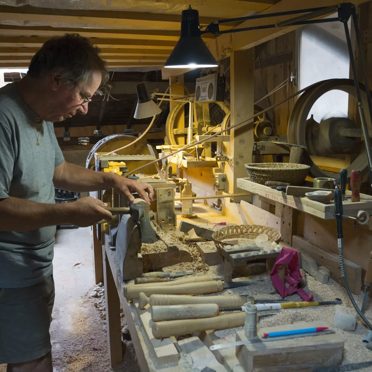 Visitez l'atelier et découvrez les différentes étapes de la fabrication des appeaux, façonnés sur des tours à courroie du XVIIIème et XIXème siècles.