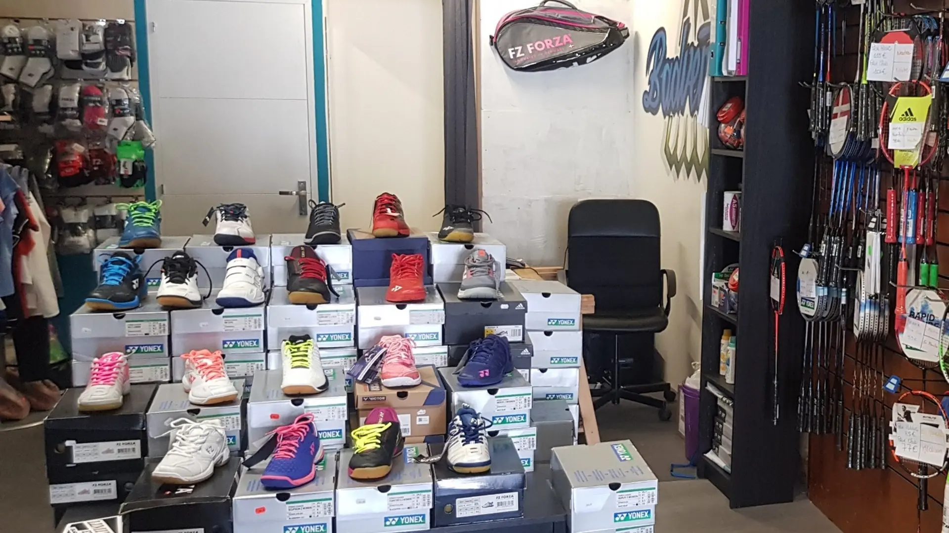 Service de flocage textile et de recordage de raquettes (badminton, squash et tennis).