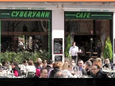 Cybercafé, accès Internet avec imprimante en noir et blanc.