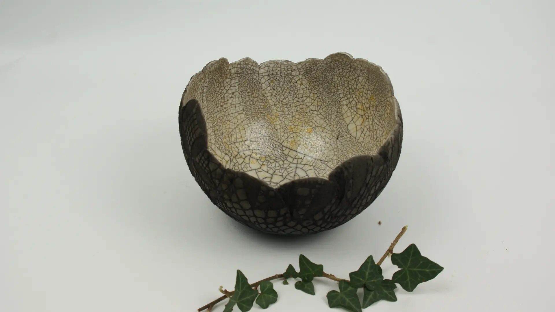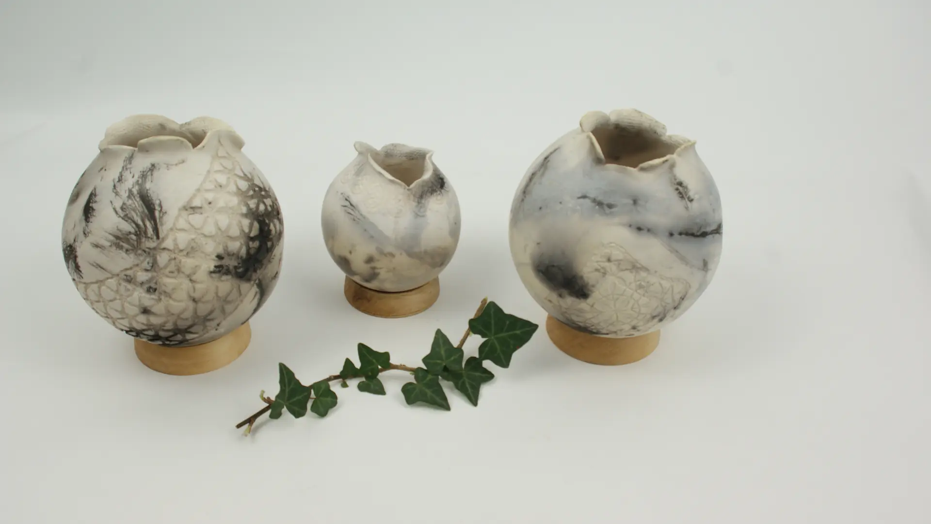 Une rencontre avec la terre, le feu, l’eau et un choc thermique qui provoque des craquelures sur les émaux de mes pièces et des parties noires enfumées ou pas.