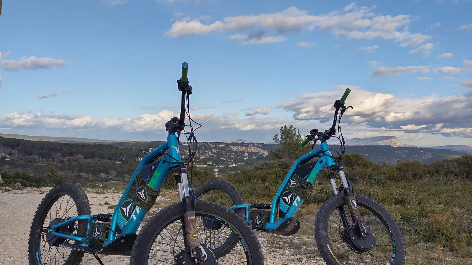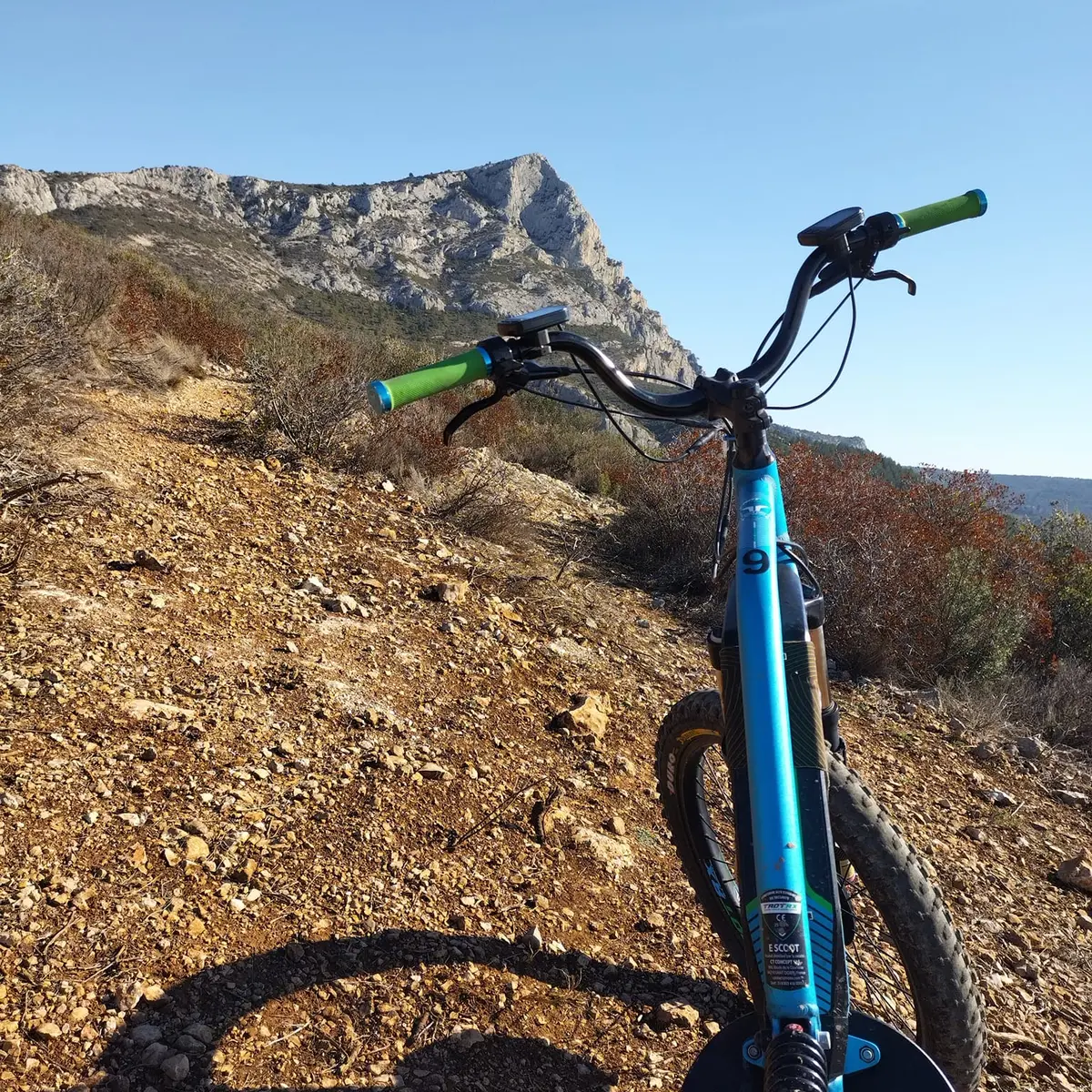 Randonnées accompagnées sur les chemins autour d'Aix-en-Provence et de la Montagne Sainte-Victoire en trottinette électrique tout-terrain.