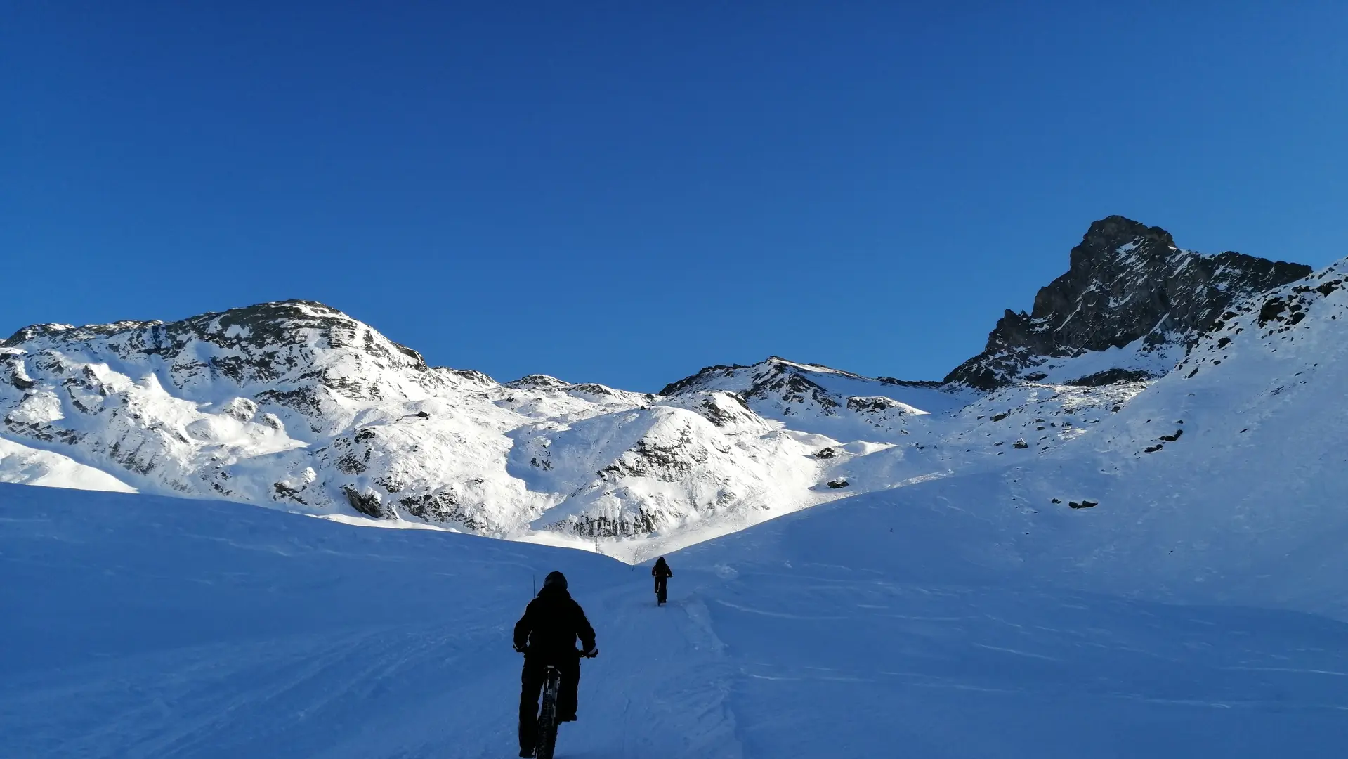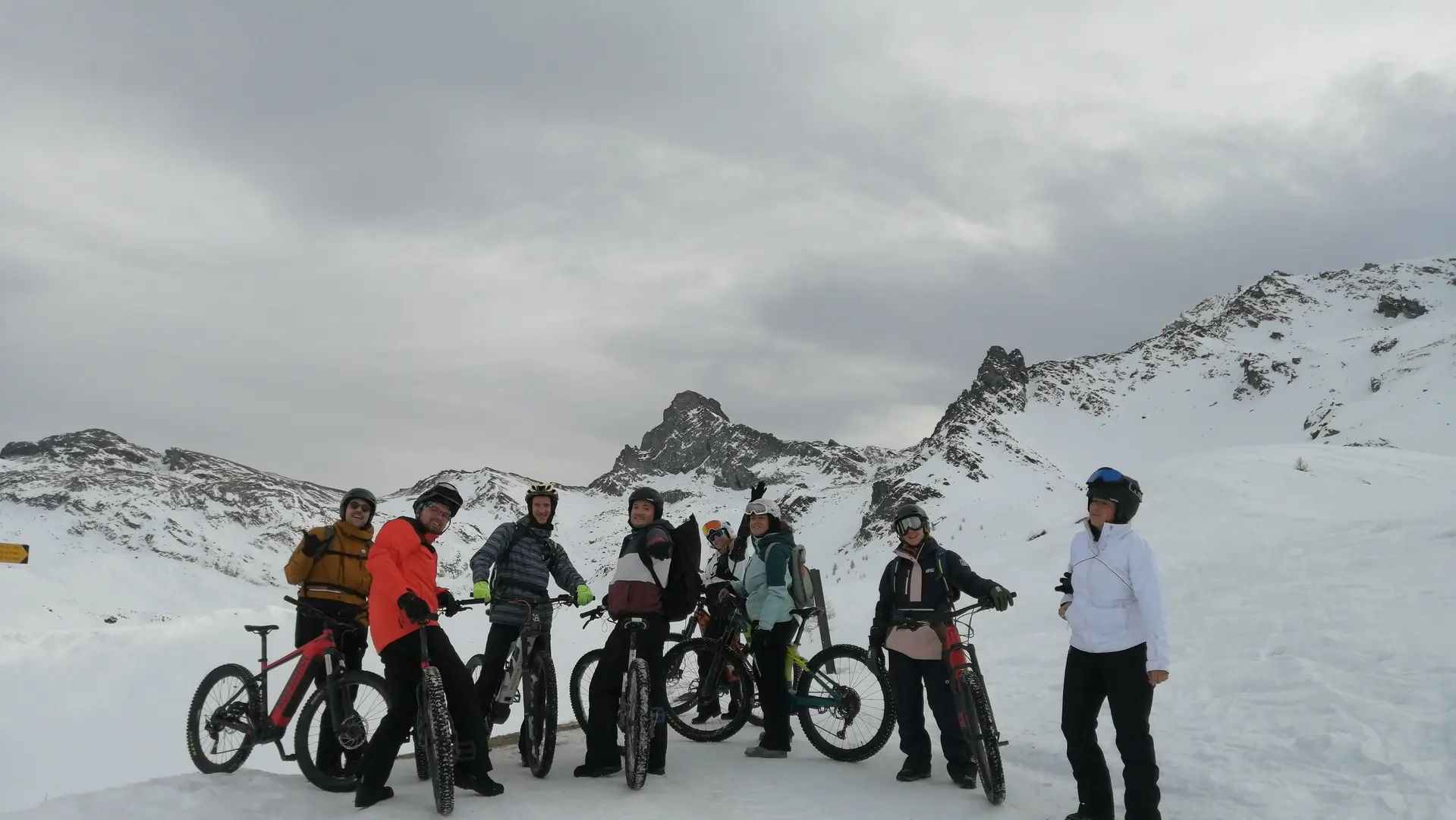 au 1er janvier 2024, les sorties VTT enduro électrique sur neige sont possibles dans la vallée de la Blanche jusqu'au refuge avec présence d'un passage glacé sur 150 mètres, mais il est possible de marcher sur le bord, avec un horaire respecté, tout se passe bien. Le guide rassure et prend les précautions pour éviter d'autres passages délicats.