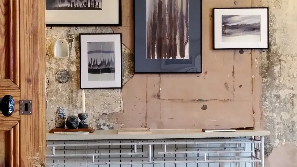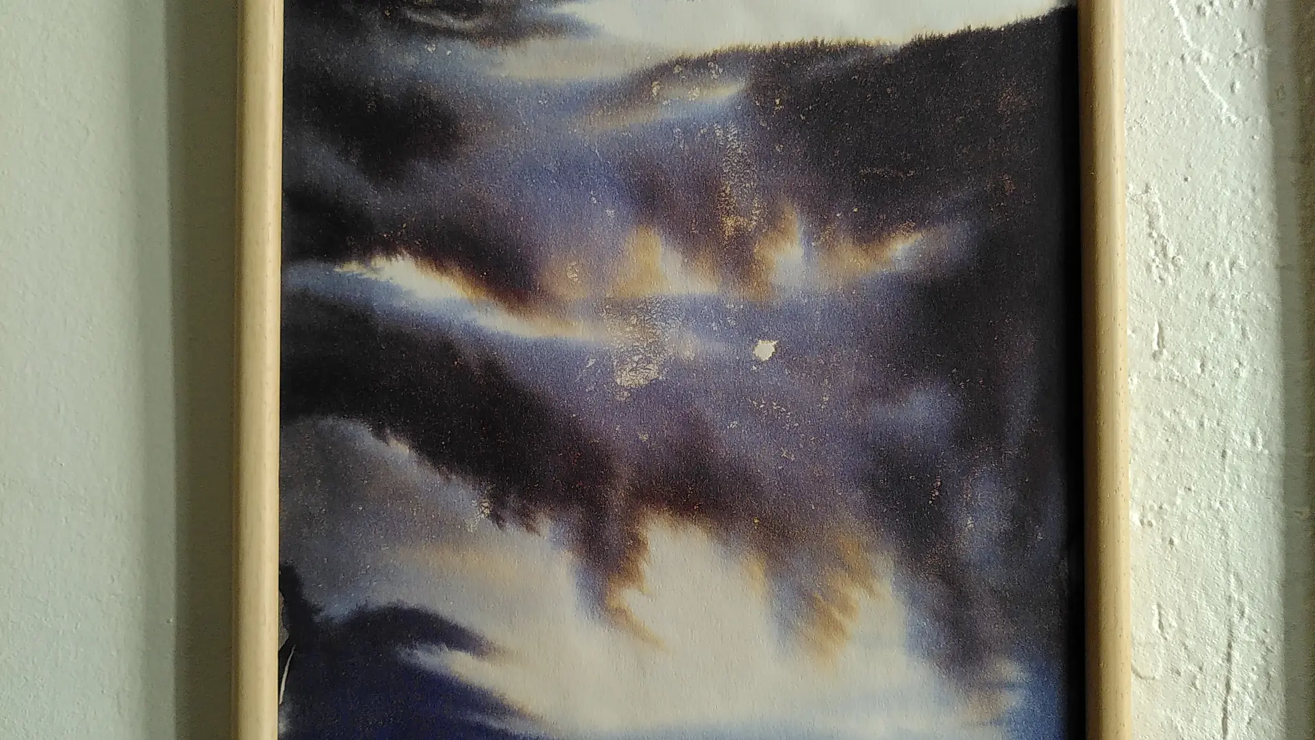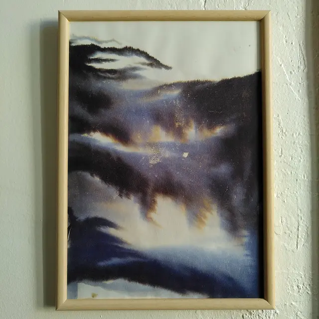 Le résultat apparaît au bout d'une danse où gouttes d'encre et d'eau cheminent à travers la fibre du papier, formant ainsi des paysages abstraits.