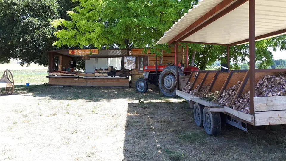 Productions de la ferme : Pommes de terre, courgettes, melons, courges, ail, pêches, fraises, huile d'olive, huile de tournesol, huile de colza, salades.