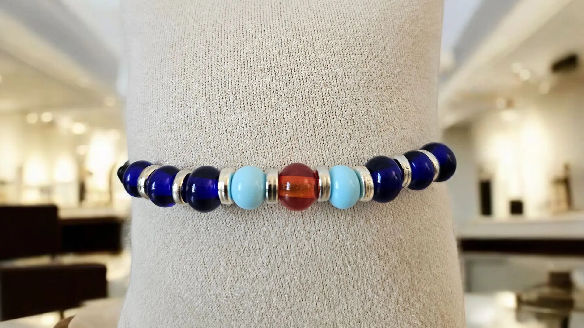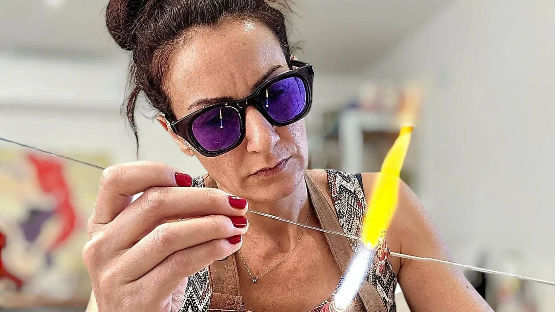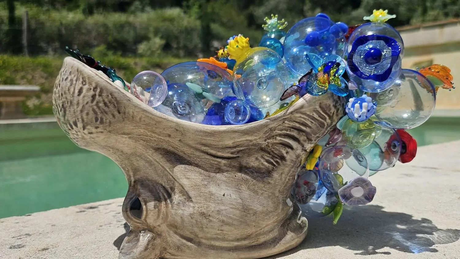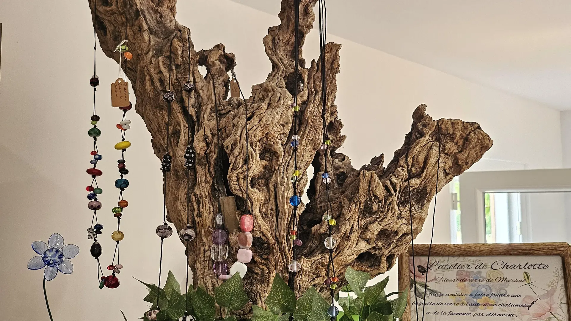 Mon atelier est à Figanières, je travaille le verre à la flamme à l’aide de mon chalumeau pour créer bijoux (boucles d'oreilles, bagues, bracelets, colliers) et objets de décoration.