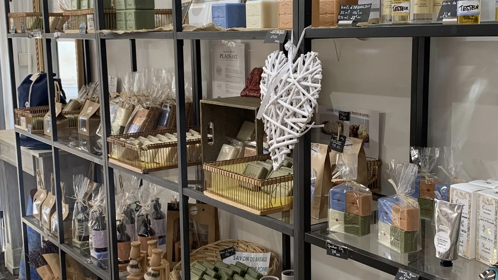 Savons solides (50, 100 ou 200 gr), savons liquides, accessoires, soins du corps, savon ménager, pétales de lavandes, huiles essentielles de lavadin, parfums d'intérieur, bougies... etc