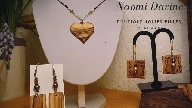 Capturant l'essence de la Provence, l'artiste Naomi Davine crée tous ses bijoux, dans sa boutique / atelier à Entrevaux. Avec du bois d'olivier de provenance locale, des pierres semi-précieuses naturelles, des perles et de l'argent de haute qualité.