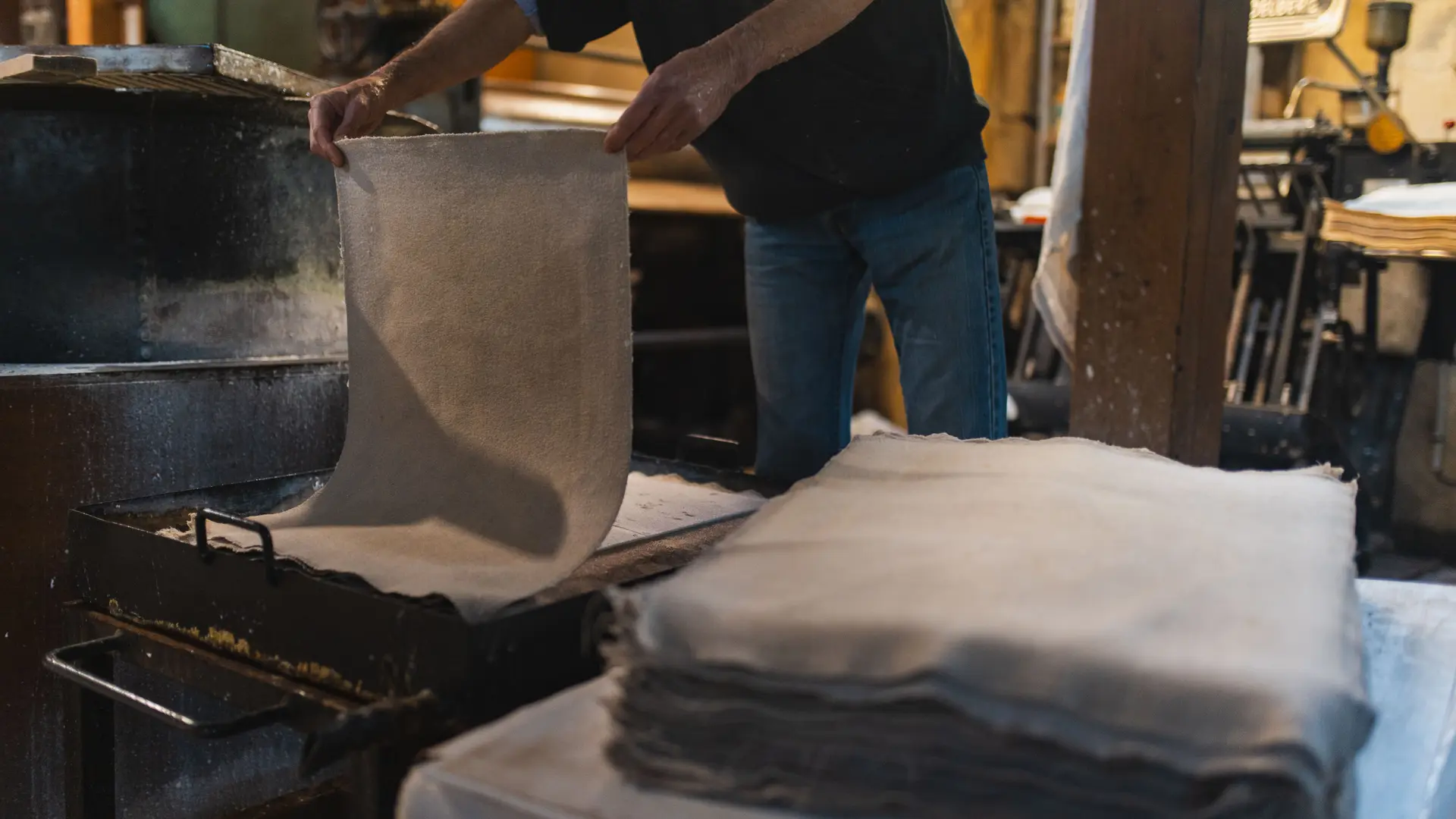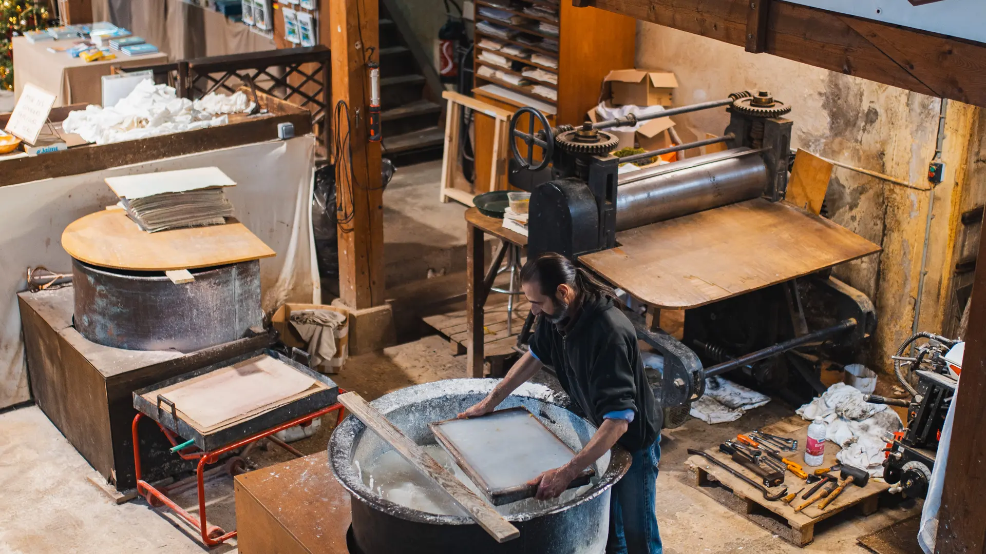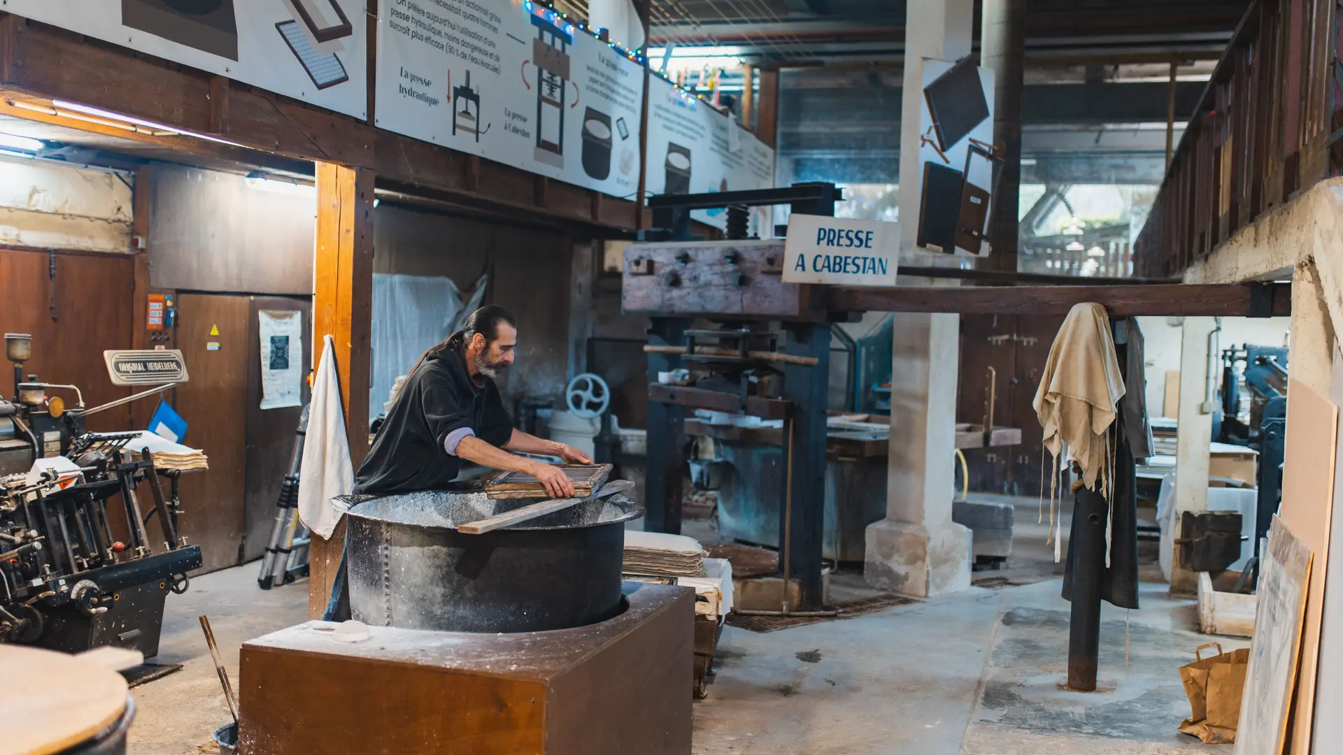 Visite libre de la fabrique du papier chiffon à la cuve, à la main comme au XVe siècle, puis importante boutique de gravures, poèmes ayant été réalisés avec ce papier. Le papier est imprimé sur place, transformé ou vendu à des aquarellistes, restaurateurs, calligraphes, éditeurs, etc. Du haut de la passerelle, le visiteur assiste au travail de la papeterie.