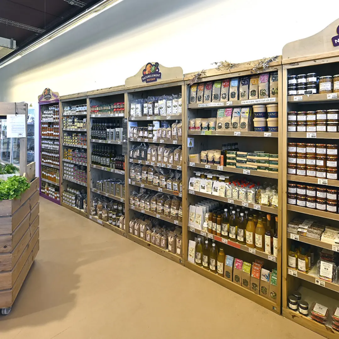 Des fruits et légumes frais ou transformés, du miel, de la biscuiterie, en passant par une gamme complète de produits laitiers et également tout un assortiment de produits carnés avec un rayon charcuterie; plus de 1200 références pour satisfaire tous les goûts.