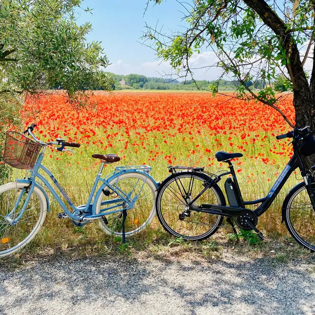 Partez à la découverte des célèbres vignobles de Châteauneuf-du-Pape ou des Dentelles de Montmirail. Admirez au fil d'une balade sur la Via Venaissia ou la Via Rhôna les magnifiques paysages que nous offre la Provence. Nous avons créé des itinéraires à télécharger gratuitement sur votre smartphone. Les vélos sont loués avec casque, sacoche sur le porte-bagage, support téléphone, cadenas et kit de réparation en cas d'avaries. Service de livraison/retrait, transfert de bagage, possibilité de récupérer/déposer les clients à la gare d’Orange.