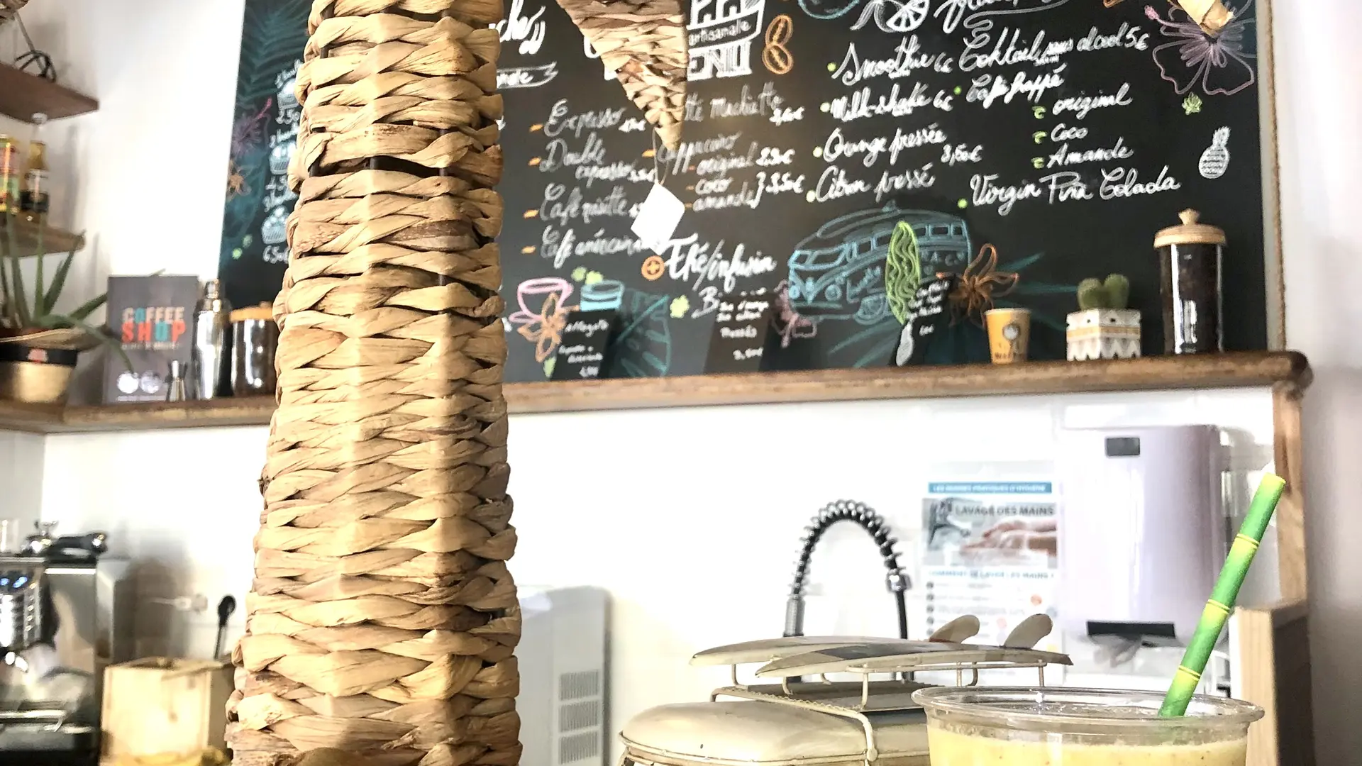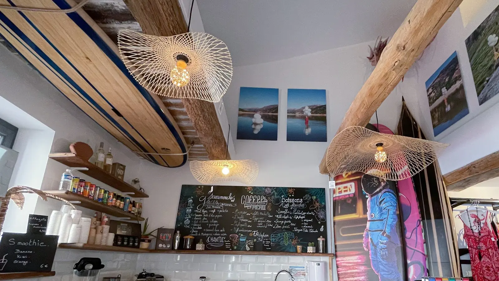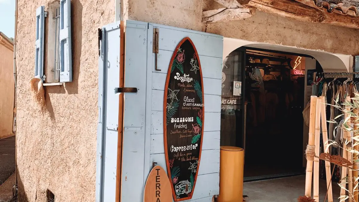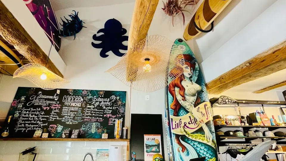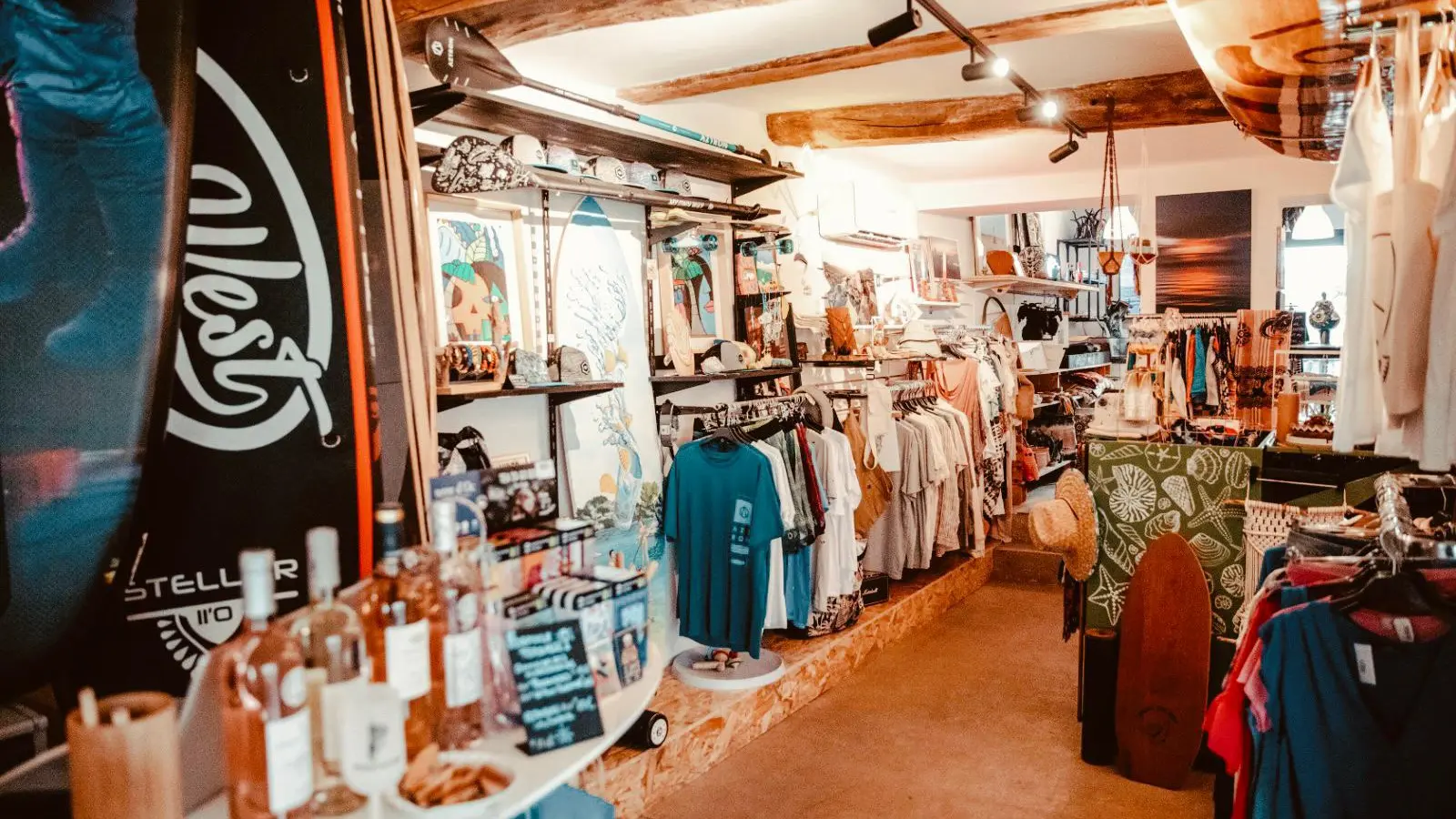 Une boutique avec une sélection de souvenirs, vêtements marque de glisse (billabong, element...), paddles en bois, paddles illustrés, articles beach style, mode, bijoux, souvenirs, décoration summer et un espace de vente d'épicerie fine.