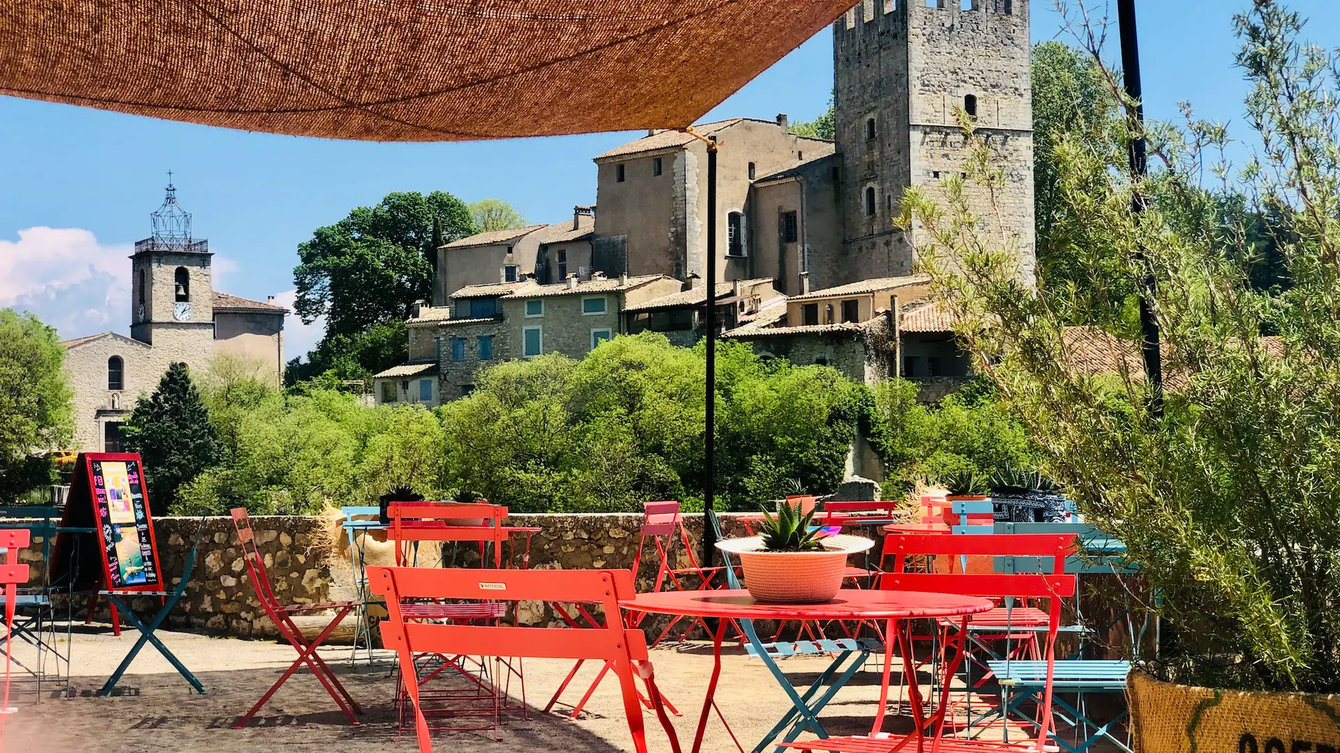 Deux terrasses avec vue sur le château et au centre du village: vente de cafés, softs, smoothie, milk-shake, cocktails.