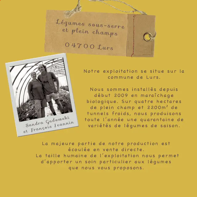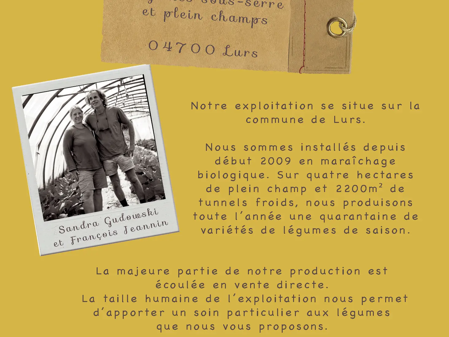 Nous sommes installés depuis début 2009 en maraîchage biologique. Sur quatre hectares de plein champ et 2200m² de tunnels froids, nous produisons toute l’année une quarantaine de variétés de légumes de saison. La majeure partie de notre production est écoulée en vente directe. La taille humaine de l’exploitation nous permet d’apporter un soin particulier aux légumes que nous vous proposons.