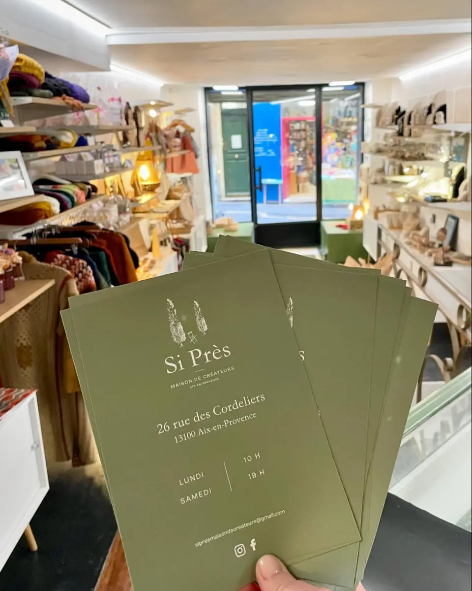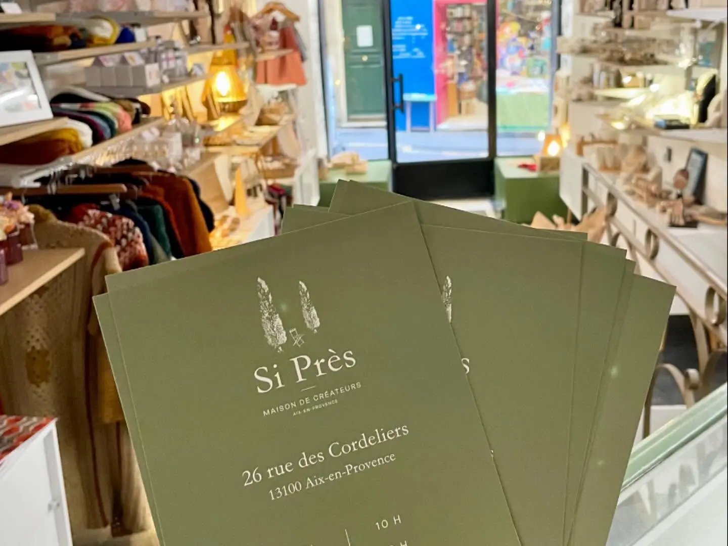 Si Près - Maison de créateurs est une boutique située au cœur d’Aix-en-Provence, dédiée à l’artisanat local et au savoir-faire. Elle rassemble des créateurs talentueux dans des domaines variés : bijoux, vêtements, accessoires, porcelaine, sculptures, et bien plus encore. Chaque pièce est réalisée à la main, en mettant en avant la qualité et l’authenticité, pour offrir une expérience unique aux visiteurs.