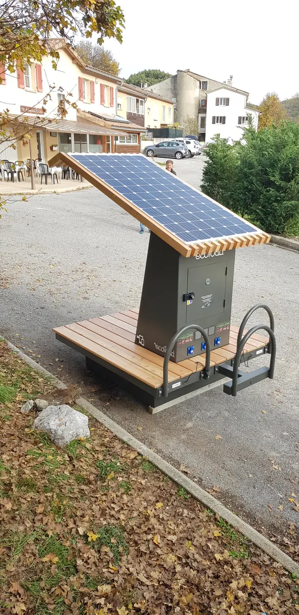 Stations de recharge solaire pour le rechargement des vélos à assistance électrique munie de trois supports vélo et de prises standards.