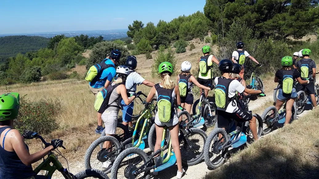 Balades accompagnées par un guide en trottinettes électriques tout terrain avec quatre parcours au choix pour la découverte des paysages de Pernes-les-Fontaines et du Comtat Venaissin.