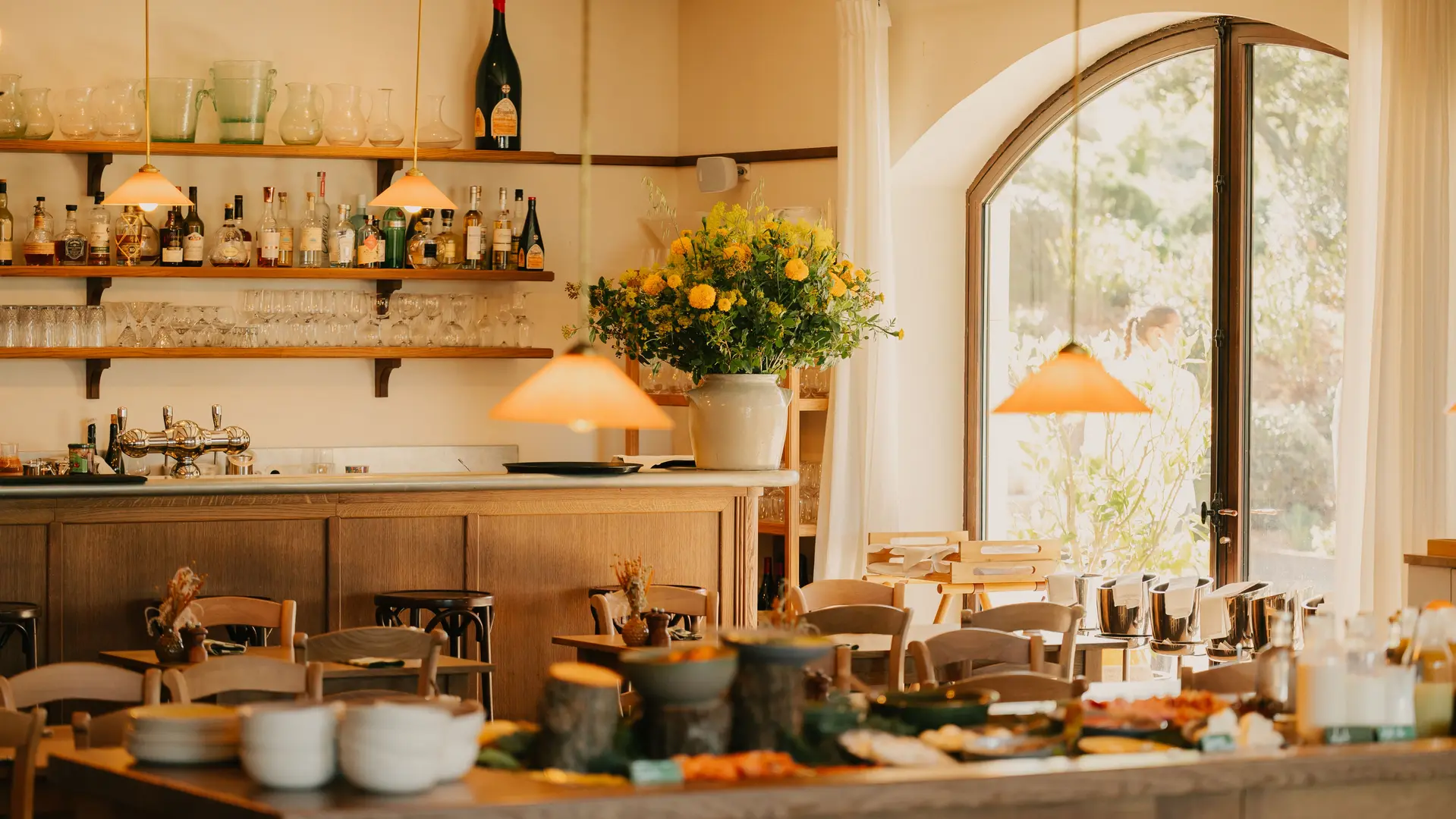 Le bar, ouvert toute la journée, est un lieu de rencontre où l’on savoure cocktails maison, vins locaux et boissons rafraîchissantes. À l’heure de l’apéritif, le spectacle du coucher de soleil face au village accompagne les premières bouchées, parmi lesquelles se distinguent la pizza à la truffe et d’autres délicieuses mises en bouche. C’est le moment idéal pour se détendre, partager un instant de convivialité et admirer la lumière dorée du Luberon.