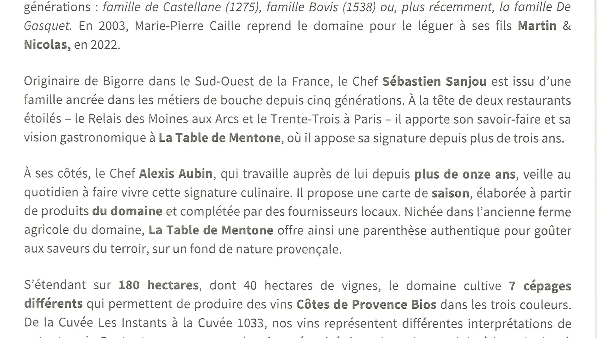 Aménagée dans l'ancienne ferme agricole, la Table de Mentone est à l'image des ambitions de ce beau domaine viticole. Ancré dans le terroir depuis plus de 180 ans, avec 32 ha de vignes certifiés en agriculture biologique, le Château Mentone cultive un véritable art de vivre en harmonie avec la nature.