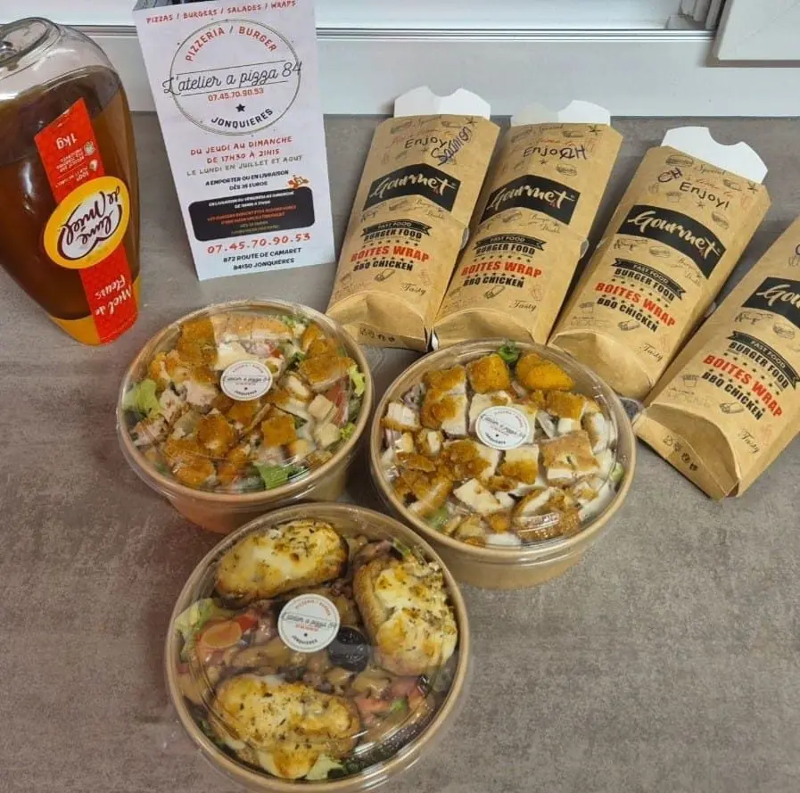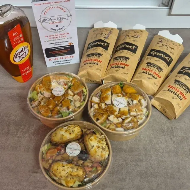 L'Atelier à Pizza vous propose une variété de produits : pizzas, burgers, frites fraîches, salades, wraps, disponibles à emporter ou livrés à domicile.