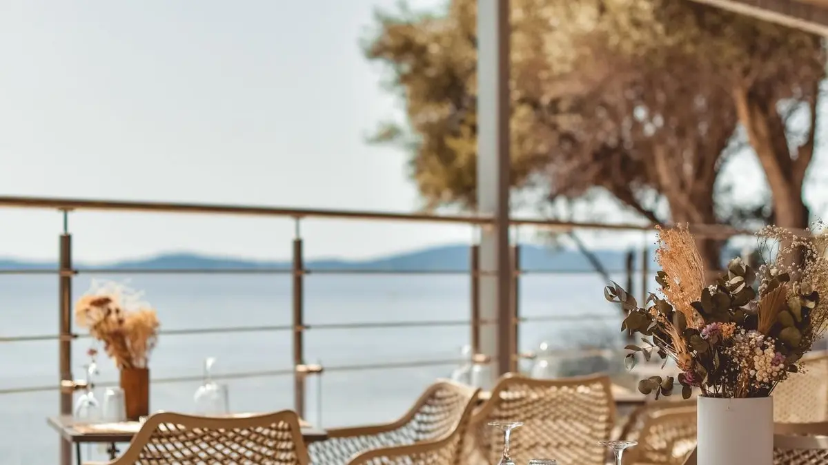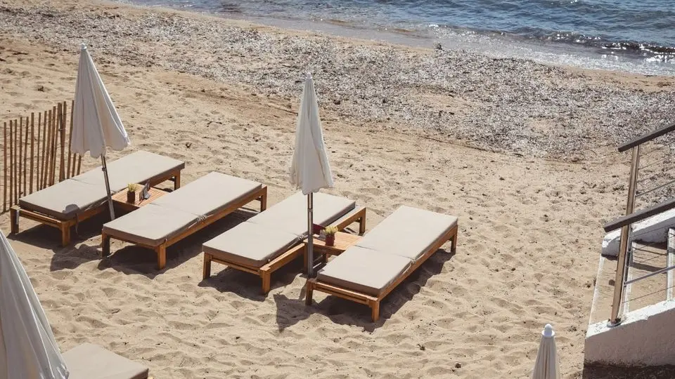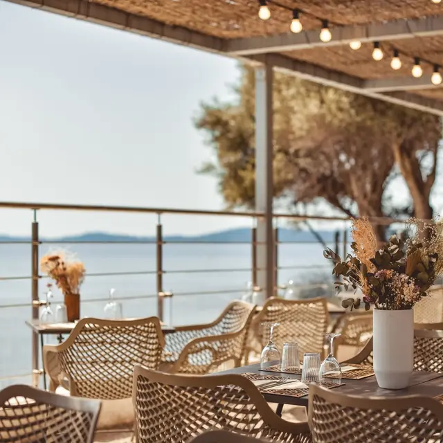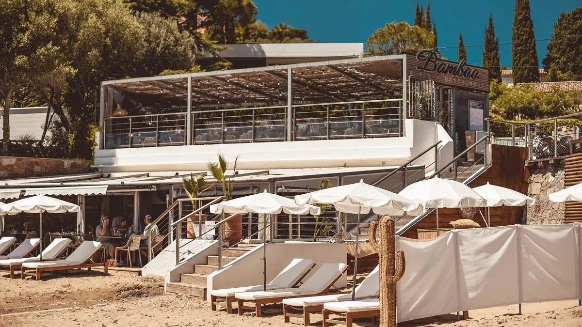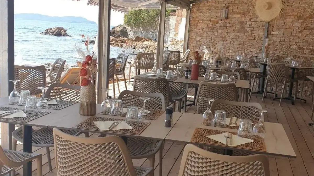 Etablissement les pieds dans l'eau sur la plage du Pradon et sa terrasse panoramique vue sur la Presqu'île de Giens.