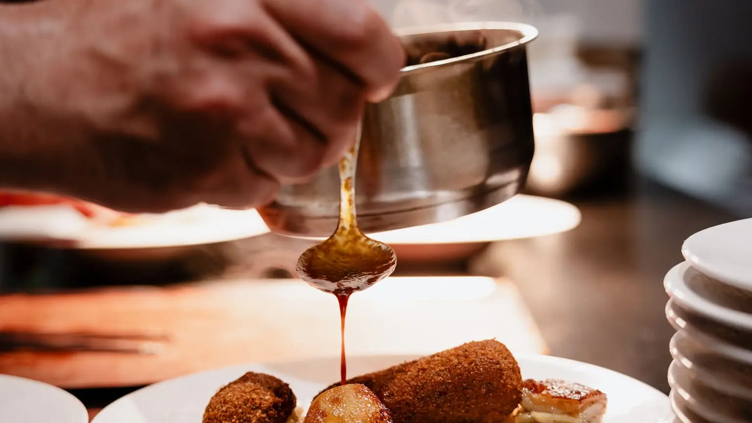 La brigade de cuisine travaille en toute transparence dans la cuisine ouverte sur la salle. Les clients peuvent donc voir la préparation de leurs mets en direct.