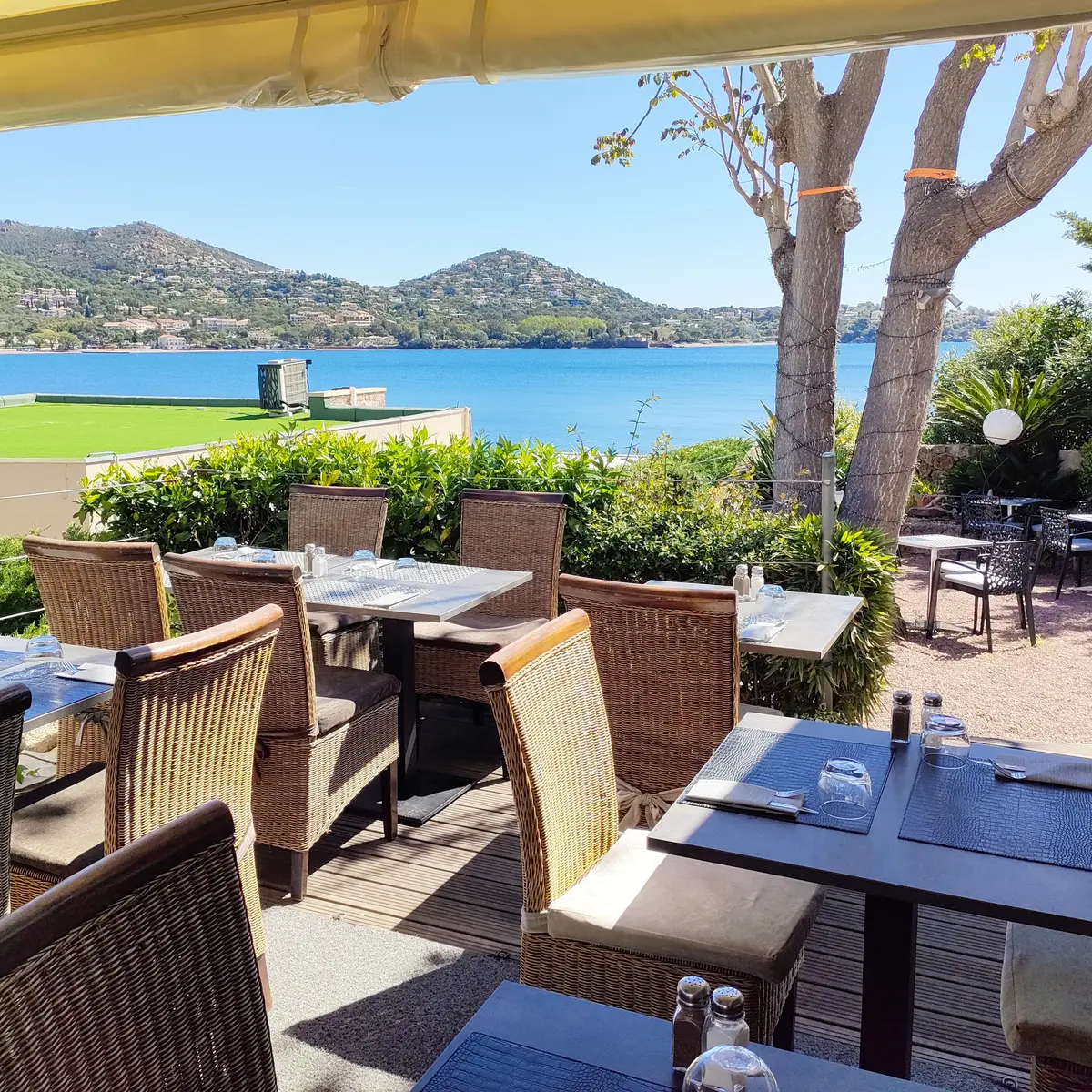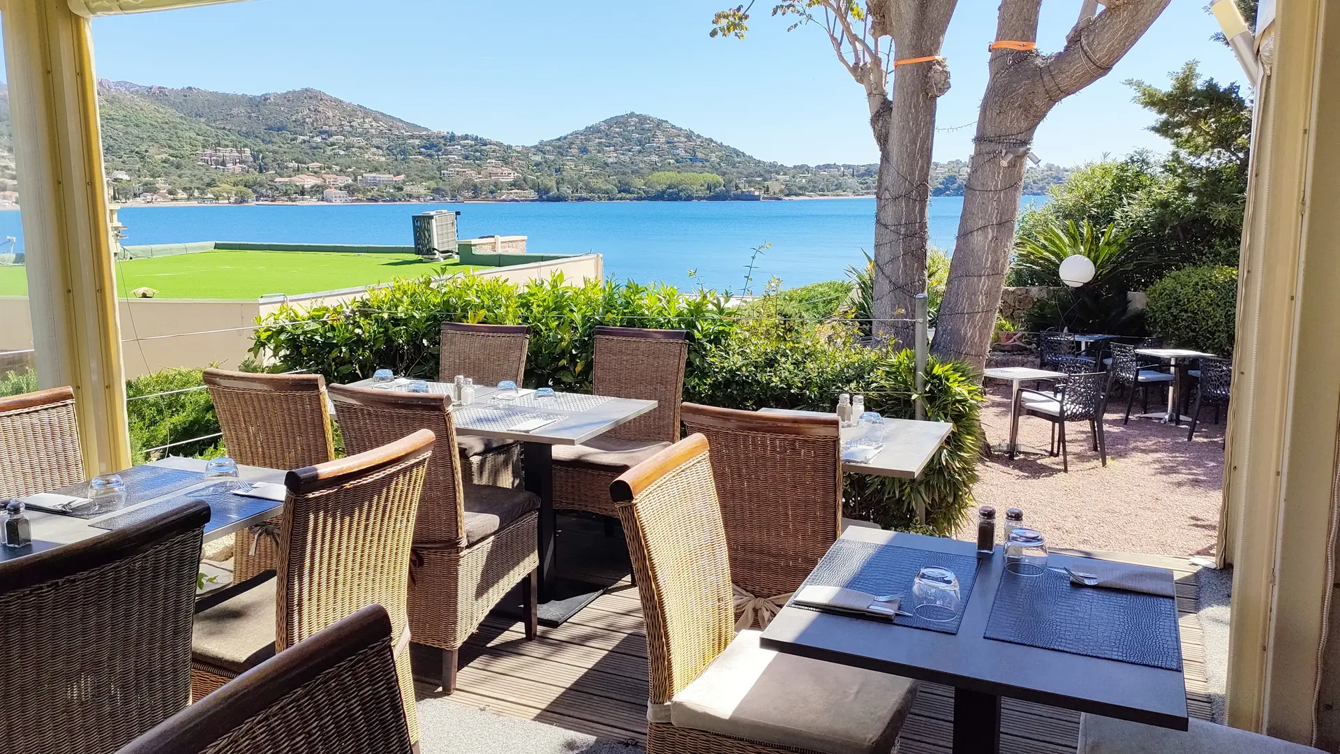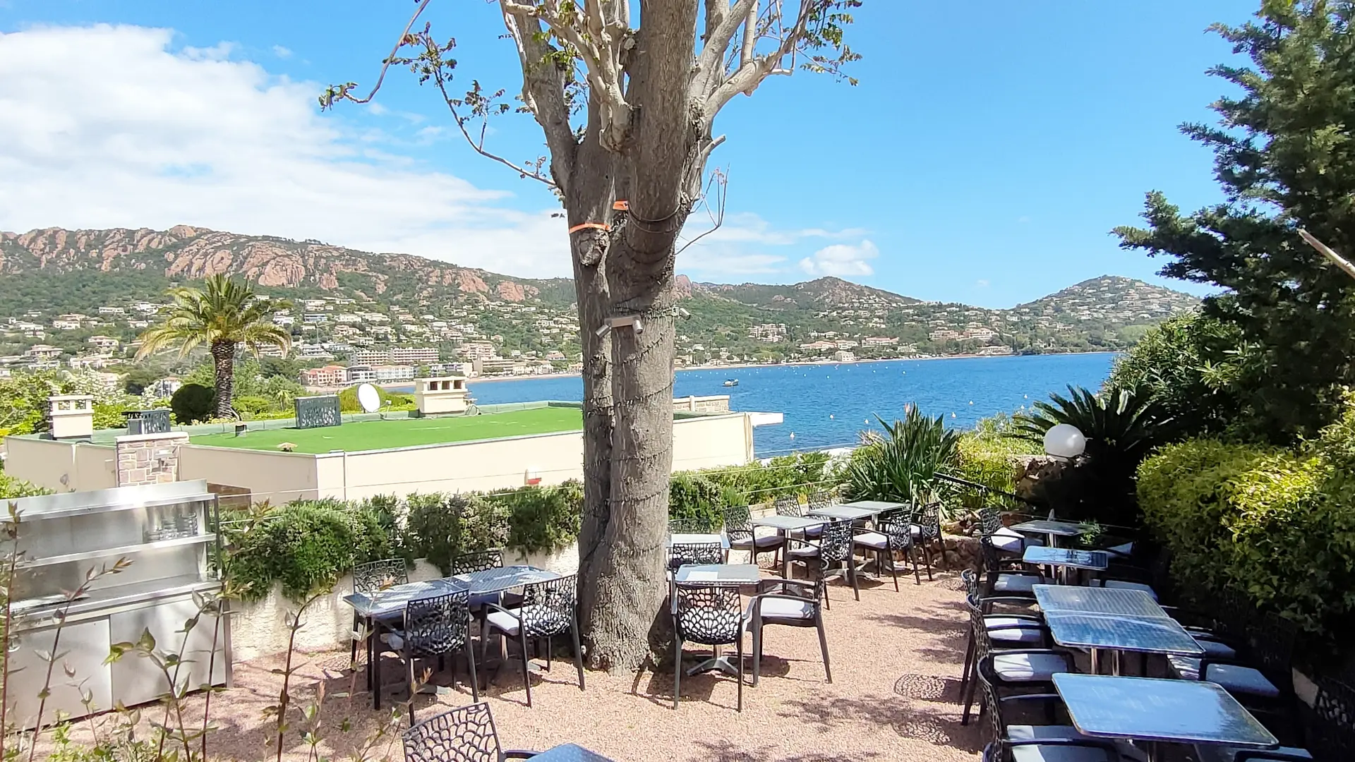 Profitez de notre magnifique terrasse avec vue sur la mer, face à la baie d'Agay. Un cadre exceptionnel pour savourer vos repas tout en admirant le panorama.