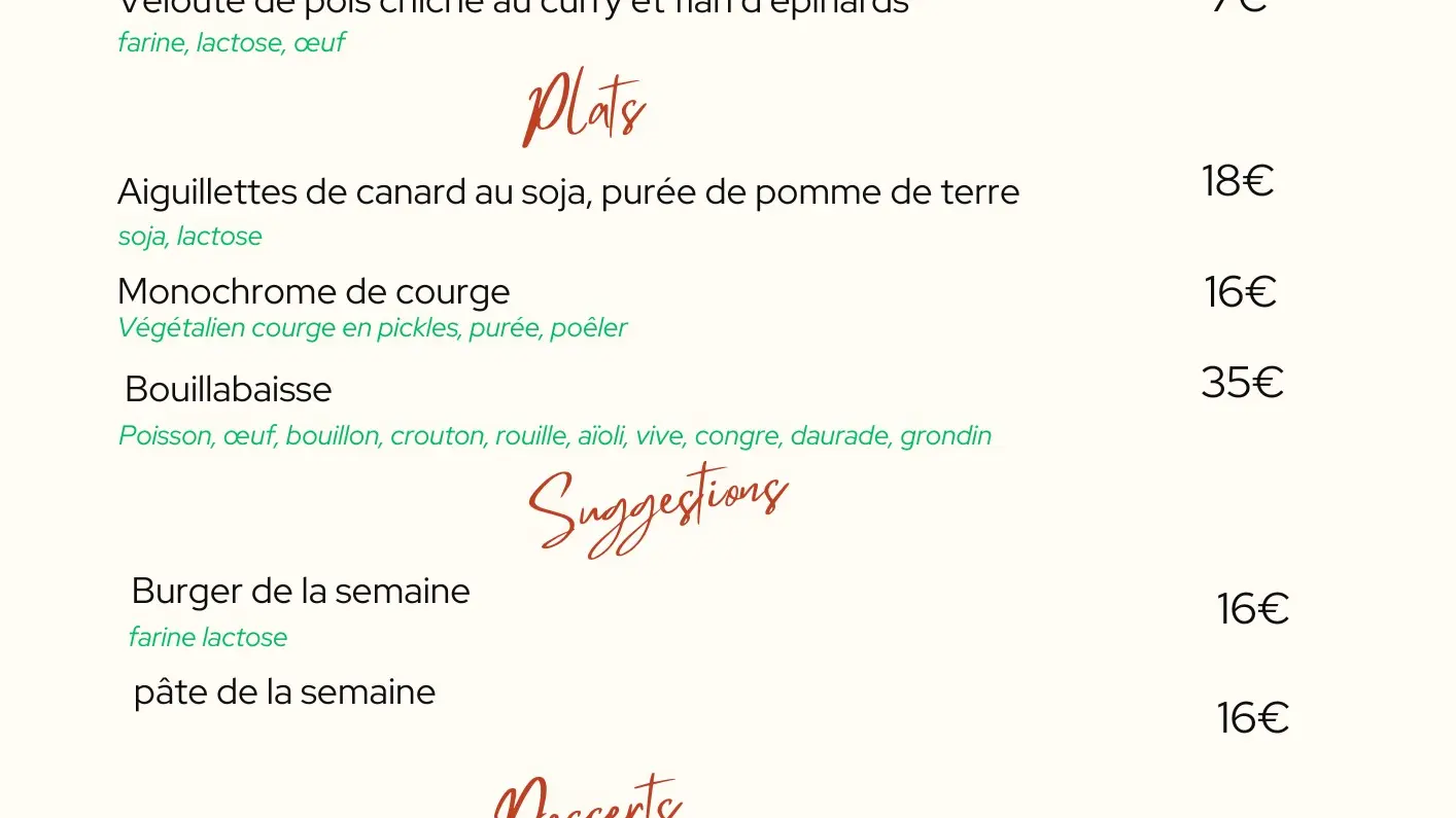 La carte est composée de 3 entrées, 3 plats, 3 desserts sur le principe d'une viande, un poisson et un végétarien.