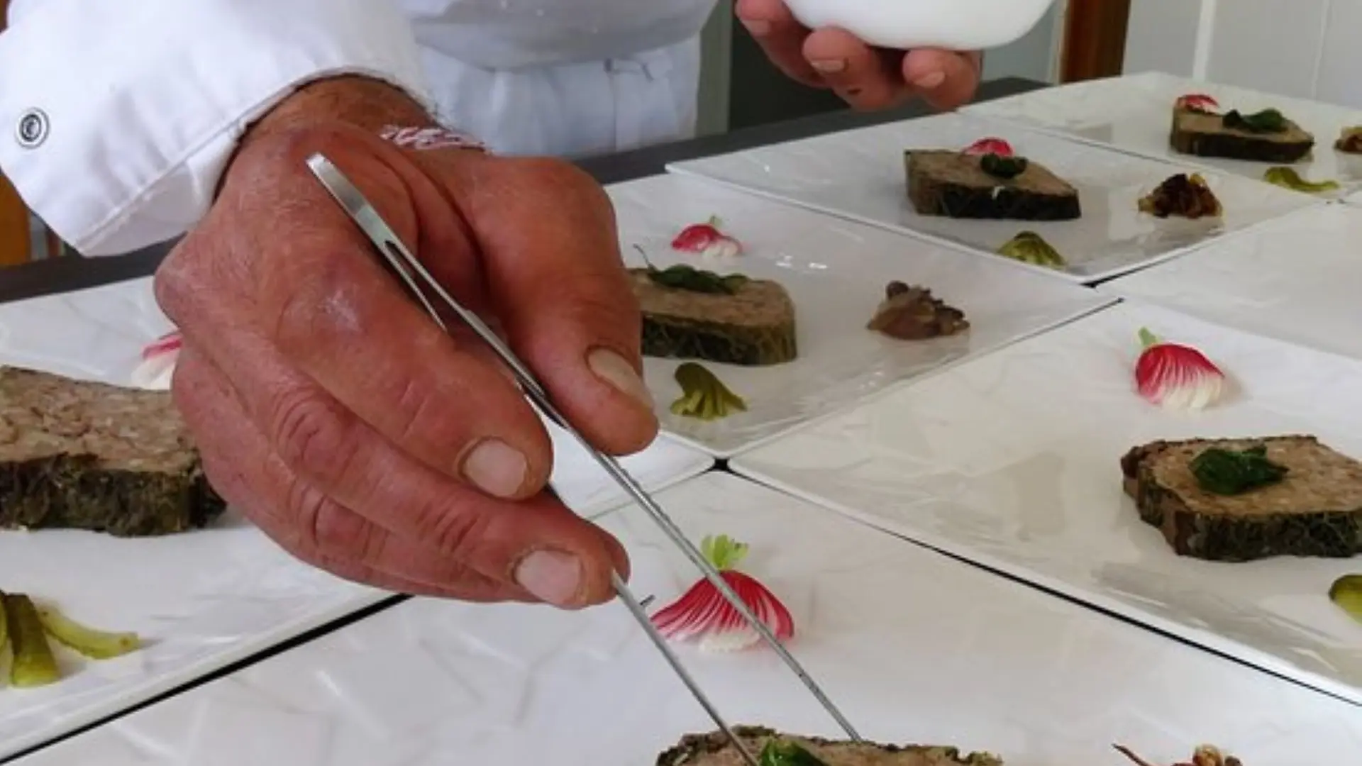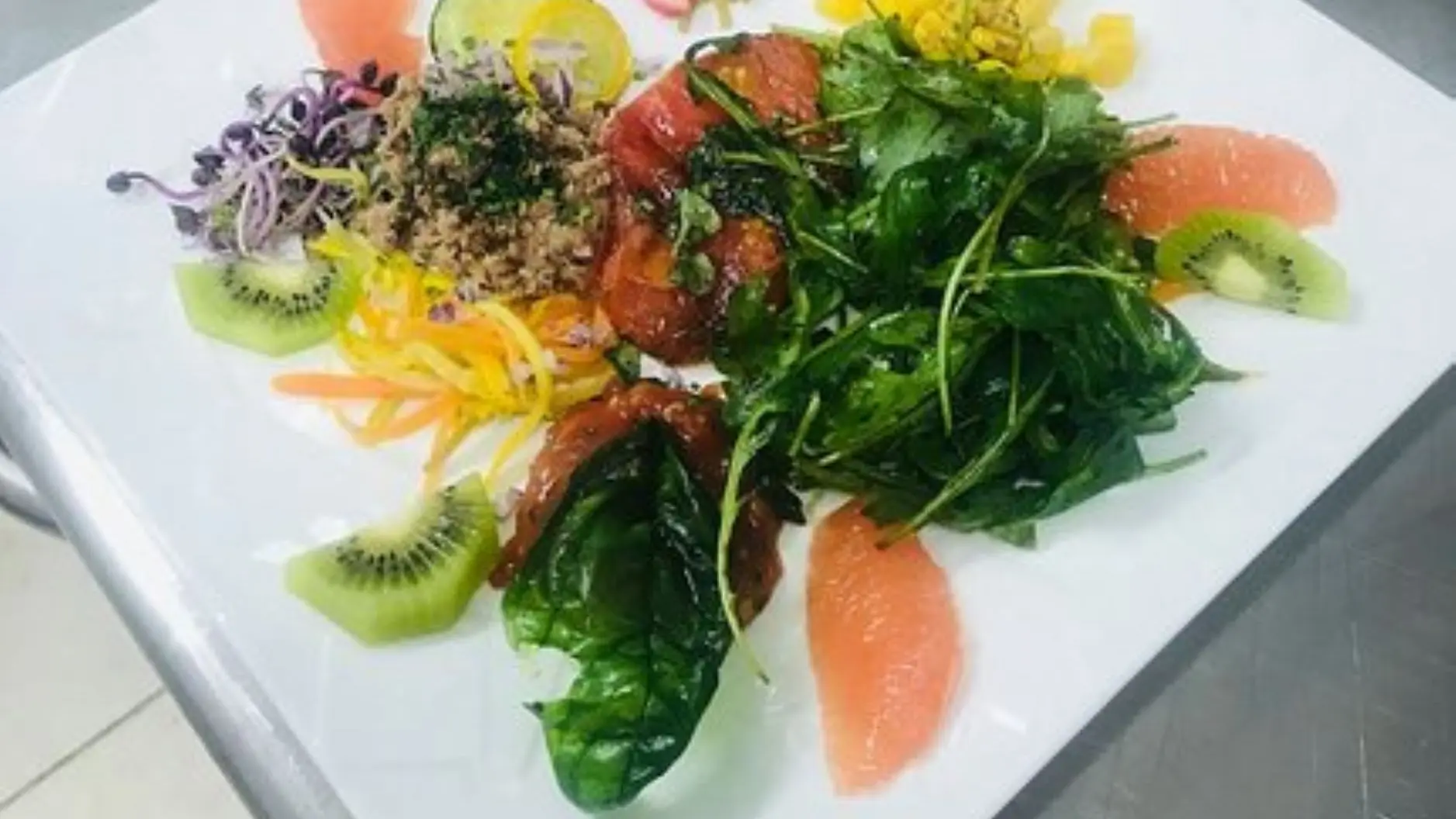 Restaurant estival dans un camping en terrasse, à l'ombre de platanes et arbres à kiwis.