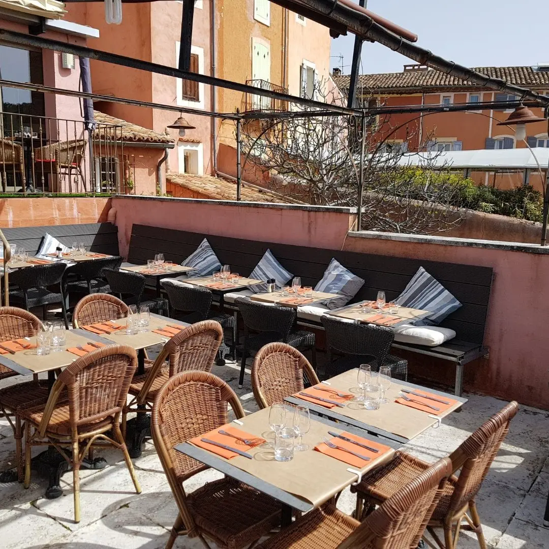 Nous vous proposons une cuisine traditionnelle dans un cadre agréable et chaleureux avec une salle lumineuse et une terrasse ensoleillée avec une vue sur les ocres et le massif du Luberon.