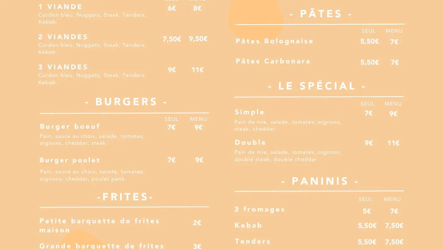 Vous y retrouverez des pâtes, des desserts et des frites maison ! Des hamburgers, des salades fraîches des tacos et pleins d’autres gourmandises !