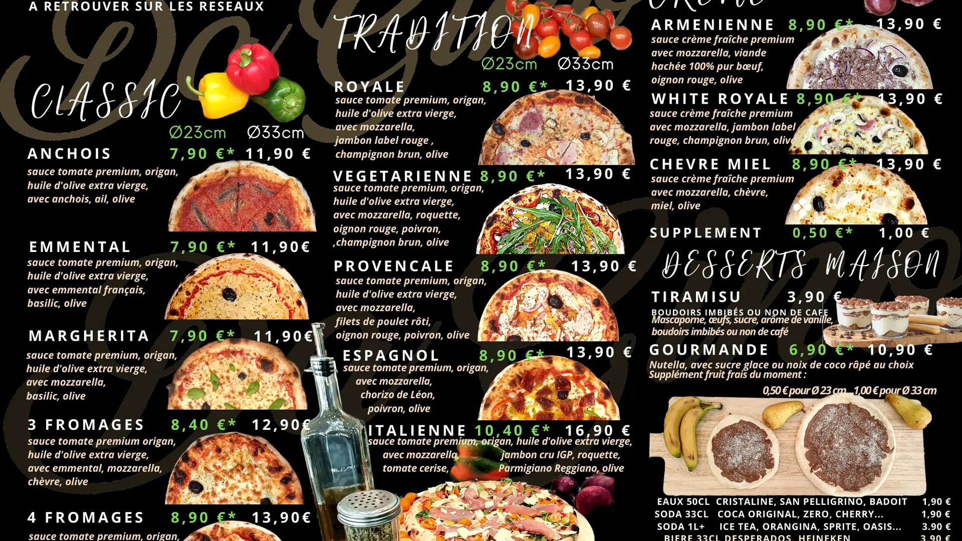 Restaurant rapide soucieux de son impact environnement, les pizzas sont en quantité limité. Pour toutes commandes supérieures à 15 pizzas il est préférable d'avertir l'établissement afin de gérer ces stocks de produits frais.