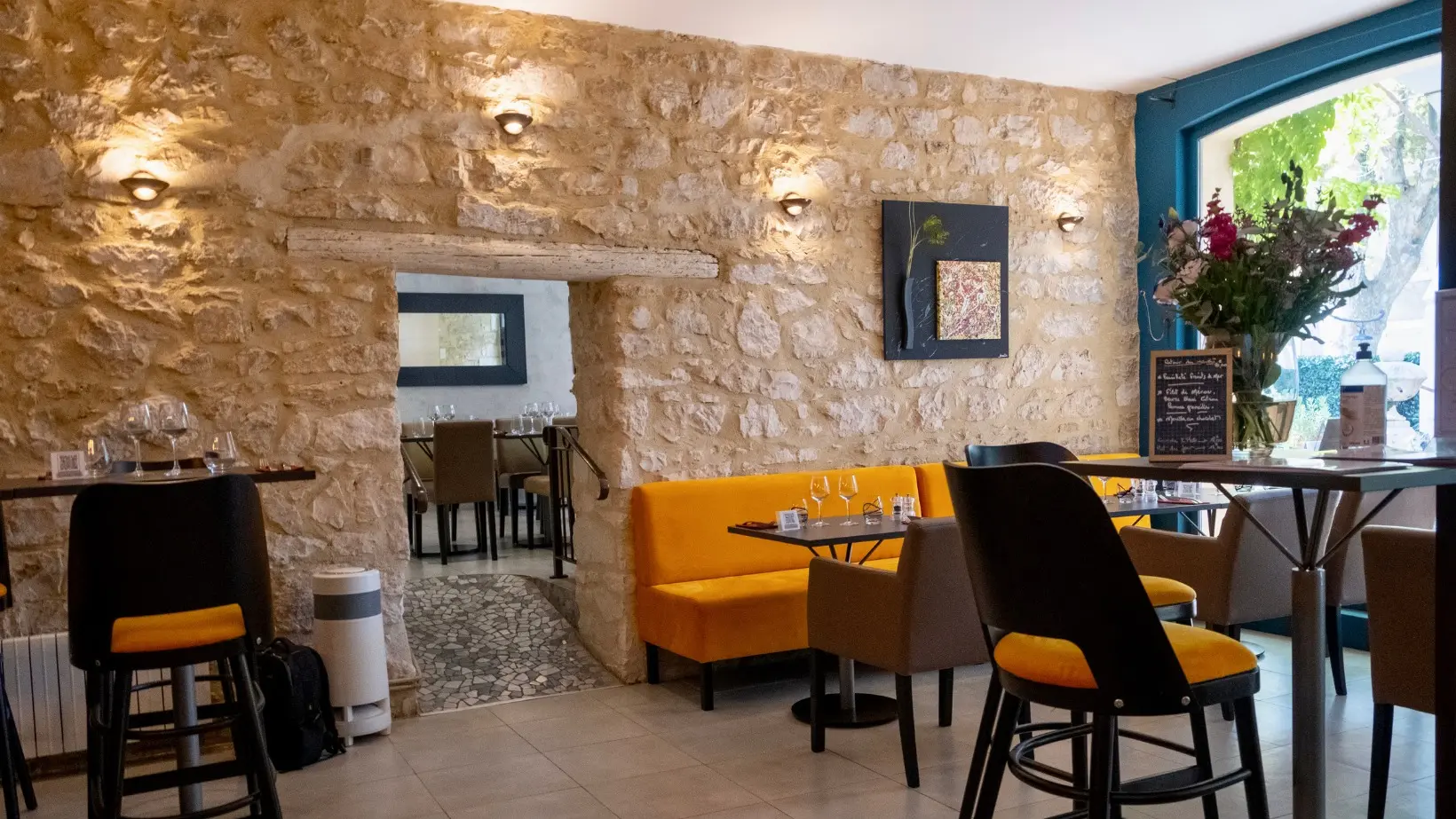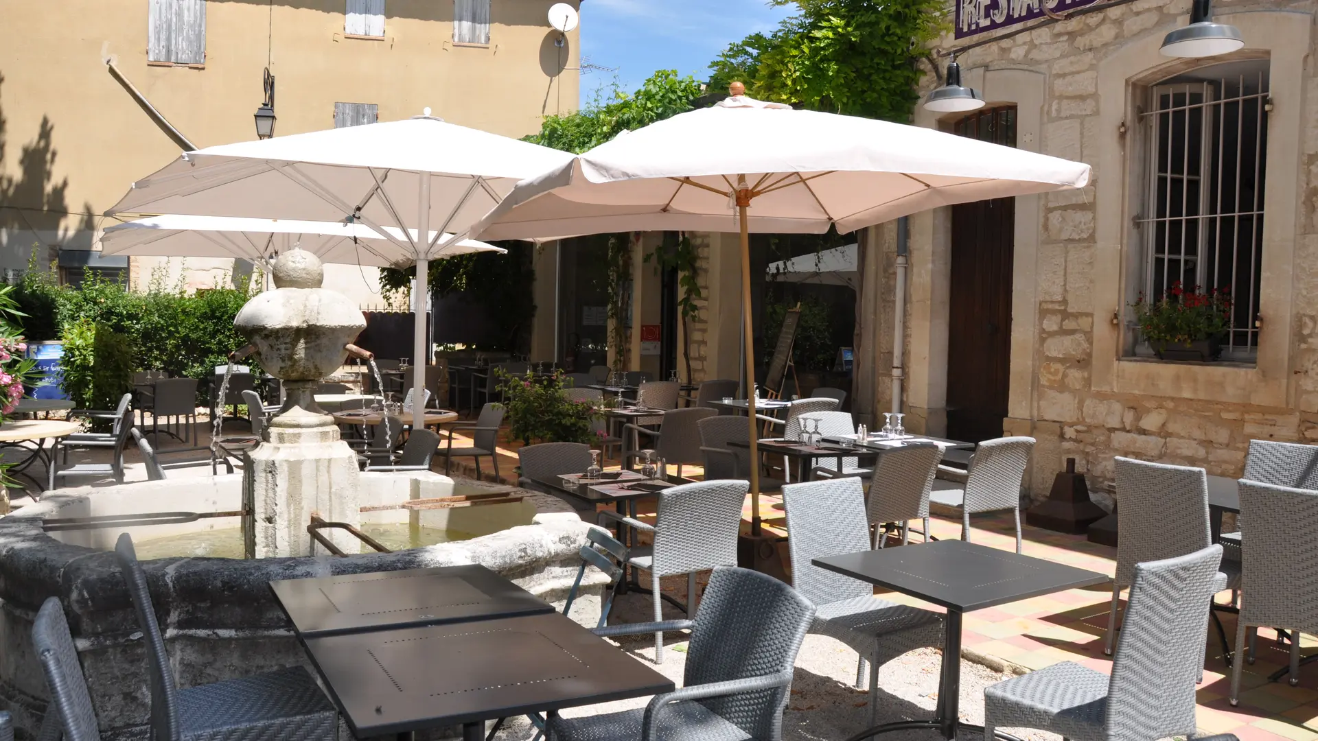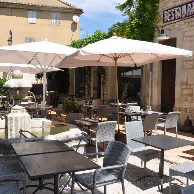 Pour les beaux jours, une magnifique terrasse ombragée permet de passer un agréable moment de détente sous les arbres anciens de notre magnifique fontaine et ou en salle climatisée dans une ambiance contemporaine avec des tables dressées avec finesse et ainsi vous faire passer d'agréables moments chez nous.