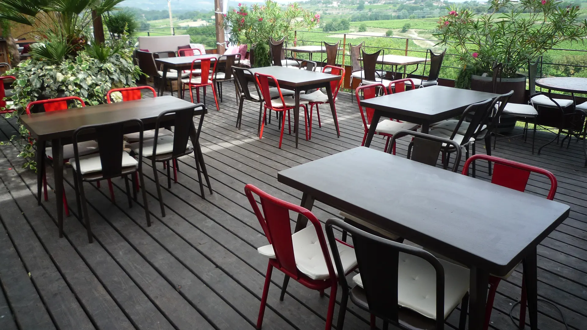 Nous vous accueillons sur la terrasse de notre bar à vins surplombant les vignes et les Baronnies.