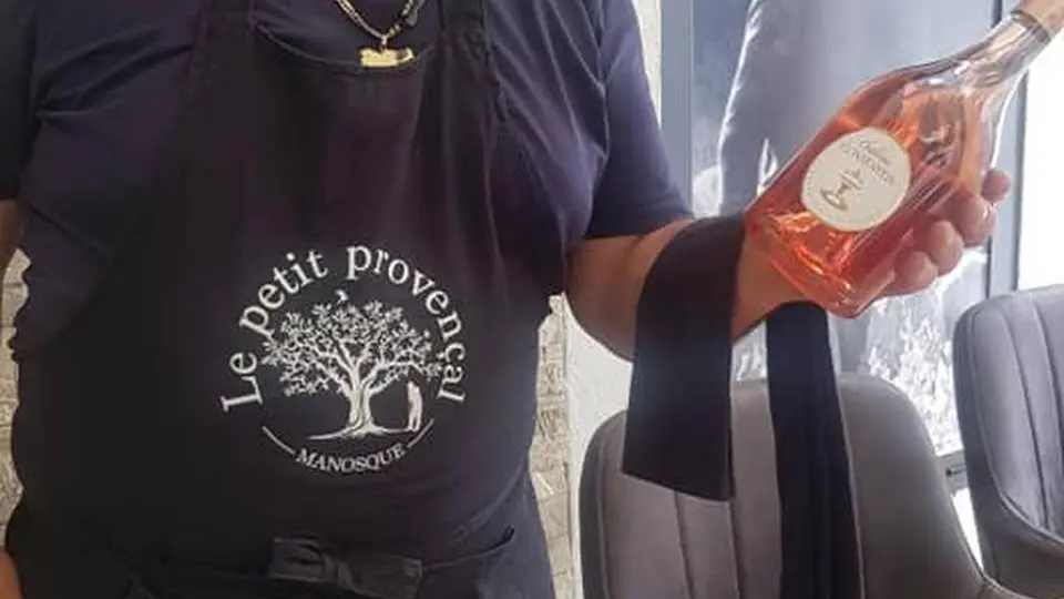 Dégustation de vin rosé en terrasse, sous le soleil de Provence, avec vue sur la campagne environnante.