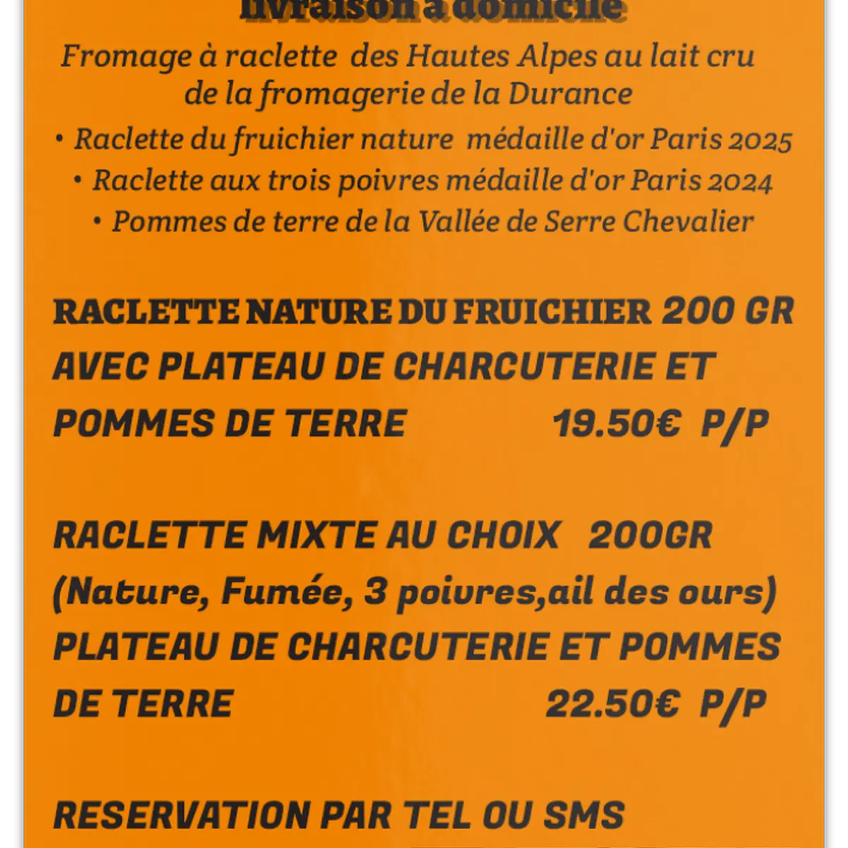 Nous proposons 4 types de raclette : nature, fumée, 3 poivres, ail des ours, pommes de terre de la Salle les Alpes.